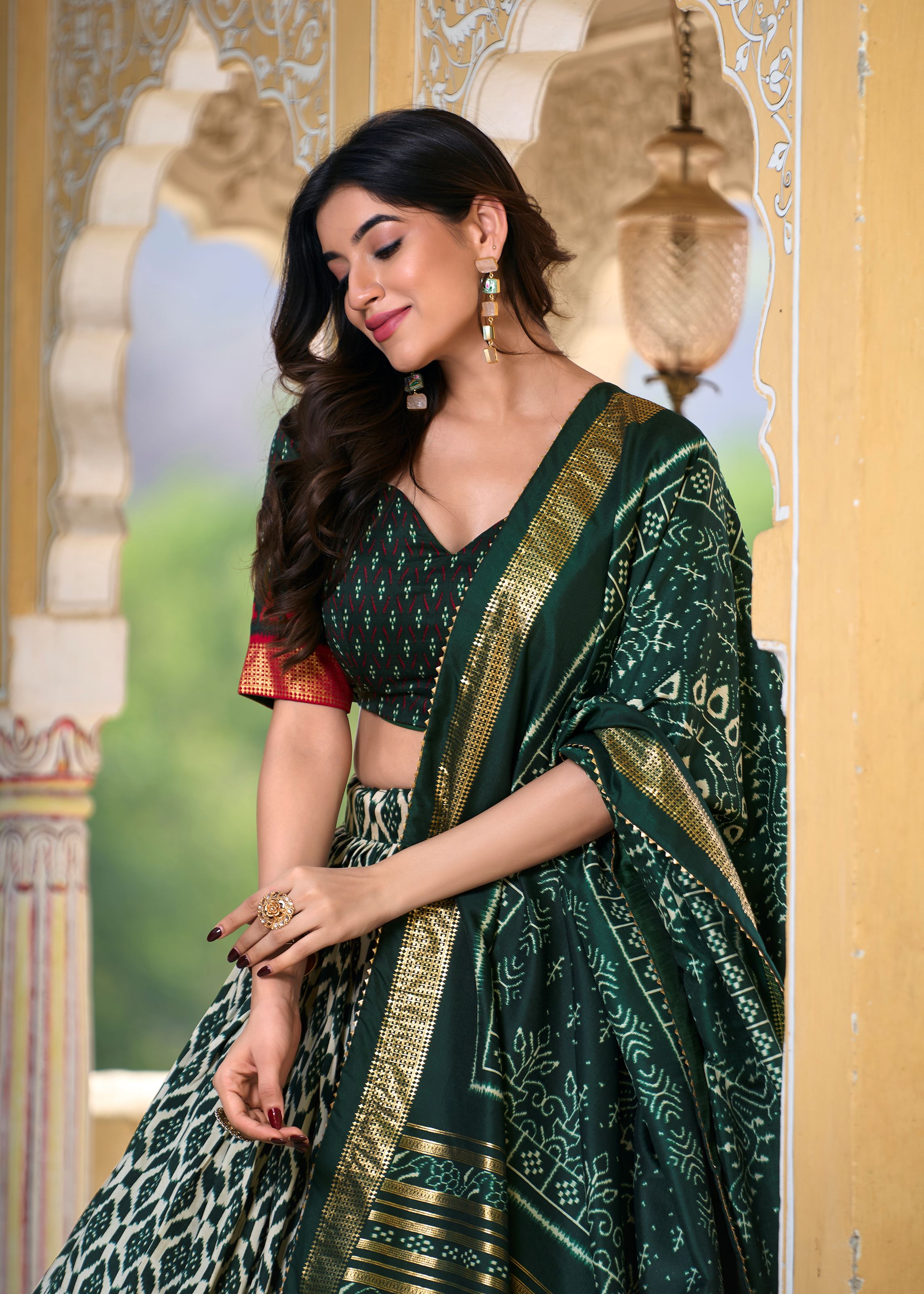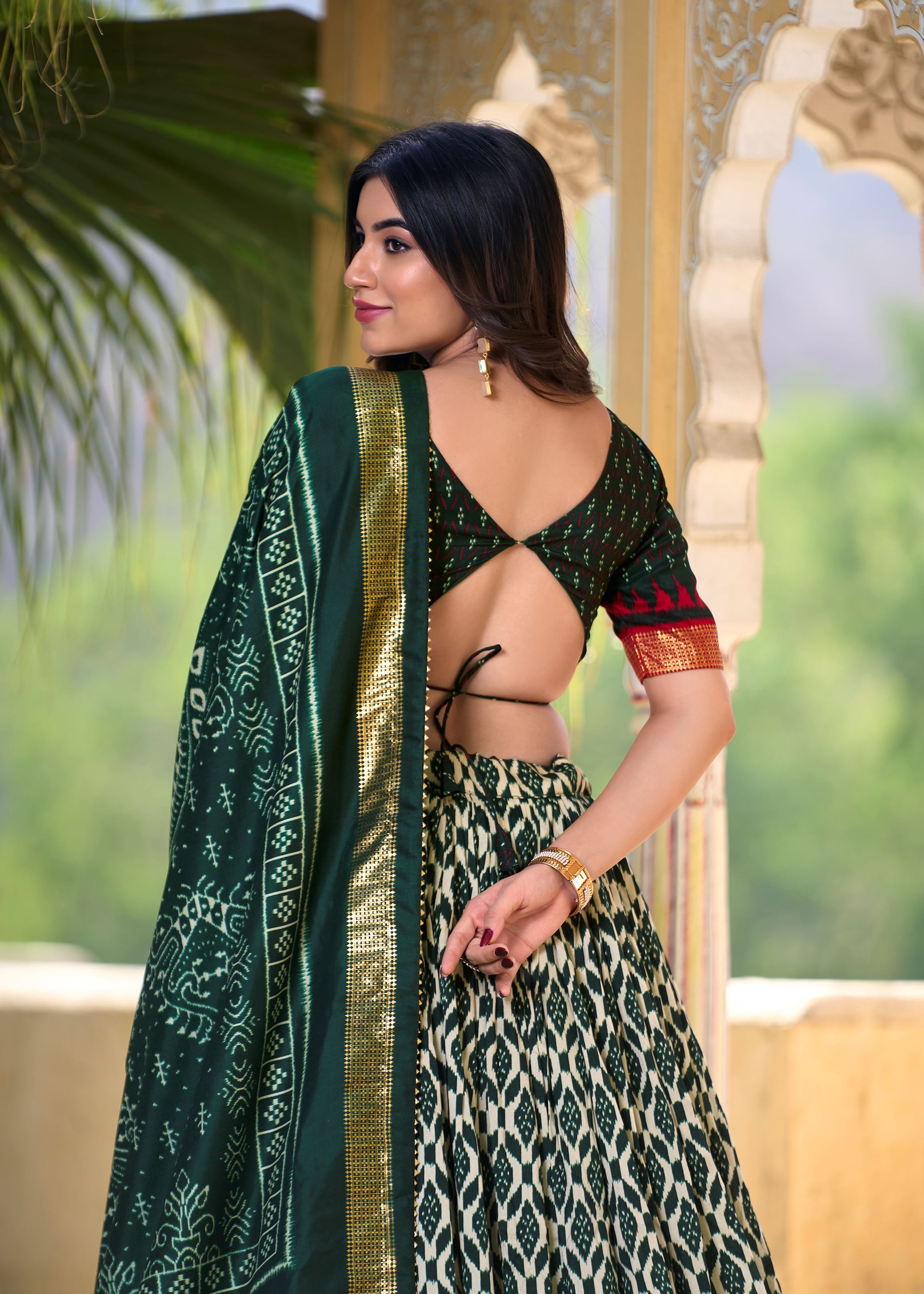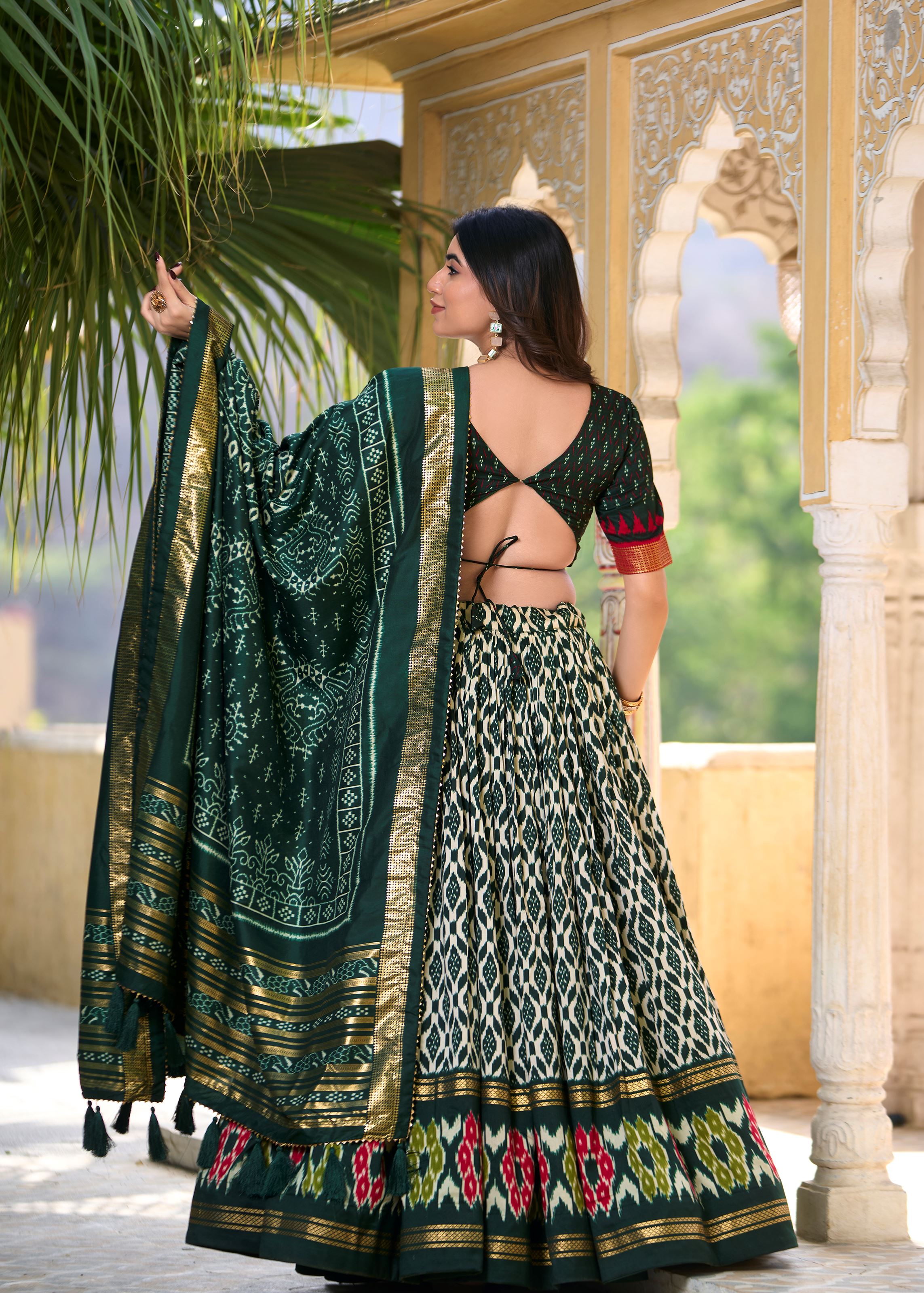 Tradition with a Sparkle Ikkat Printed Green Lehenga in Tussar Silk