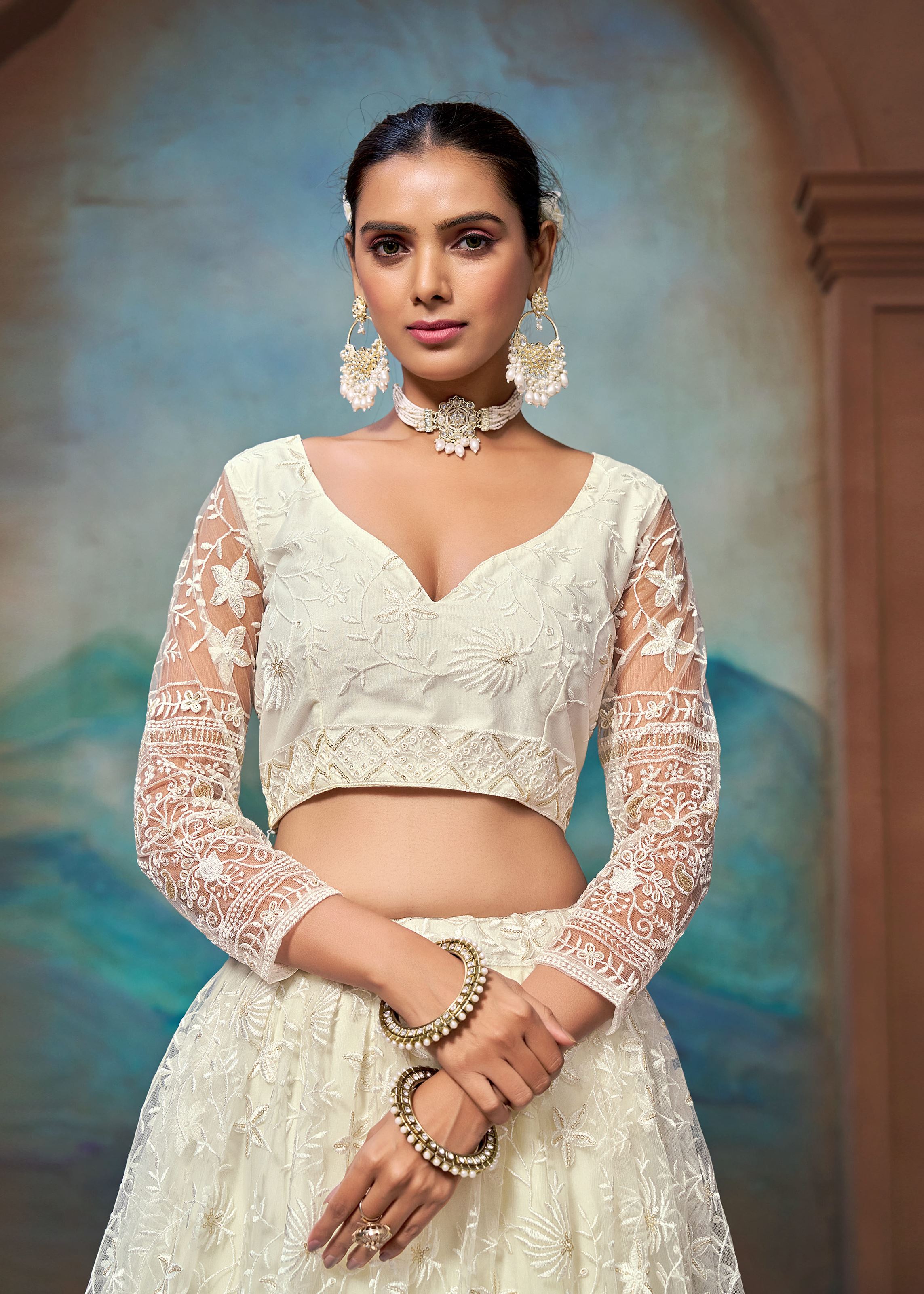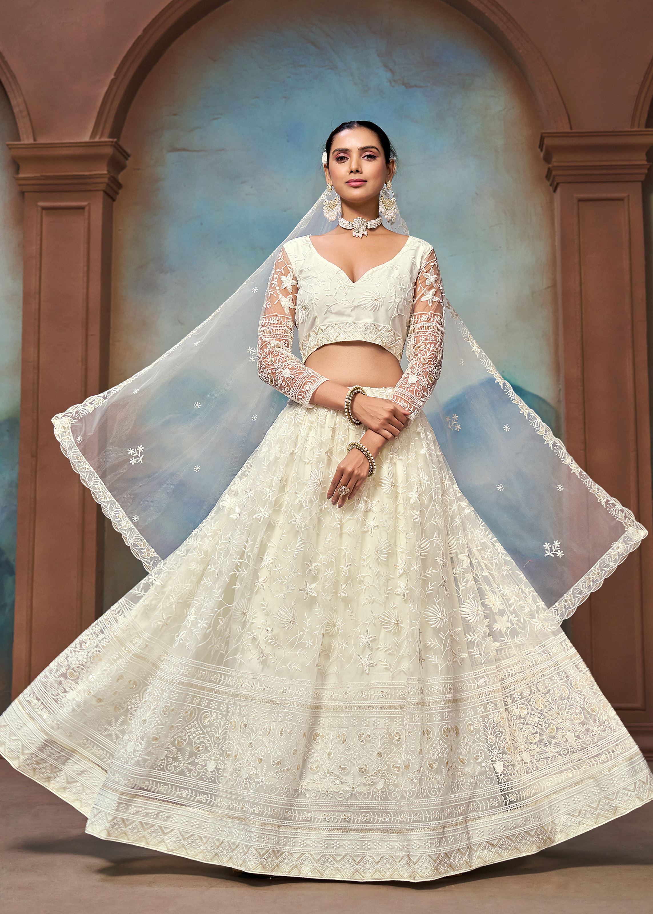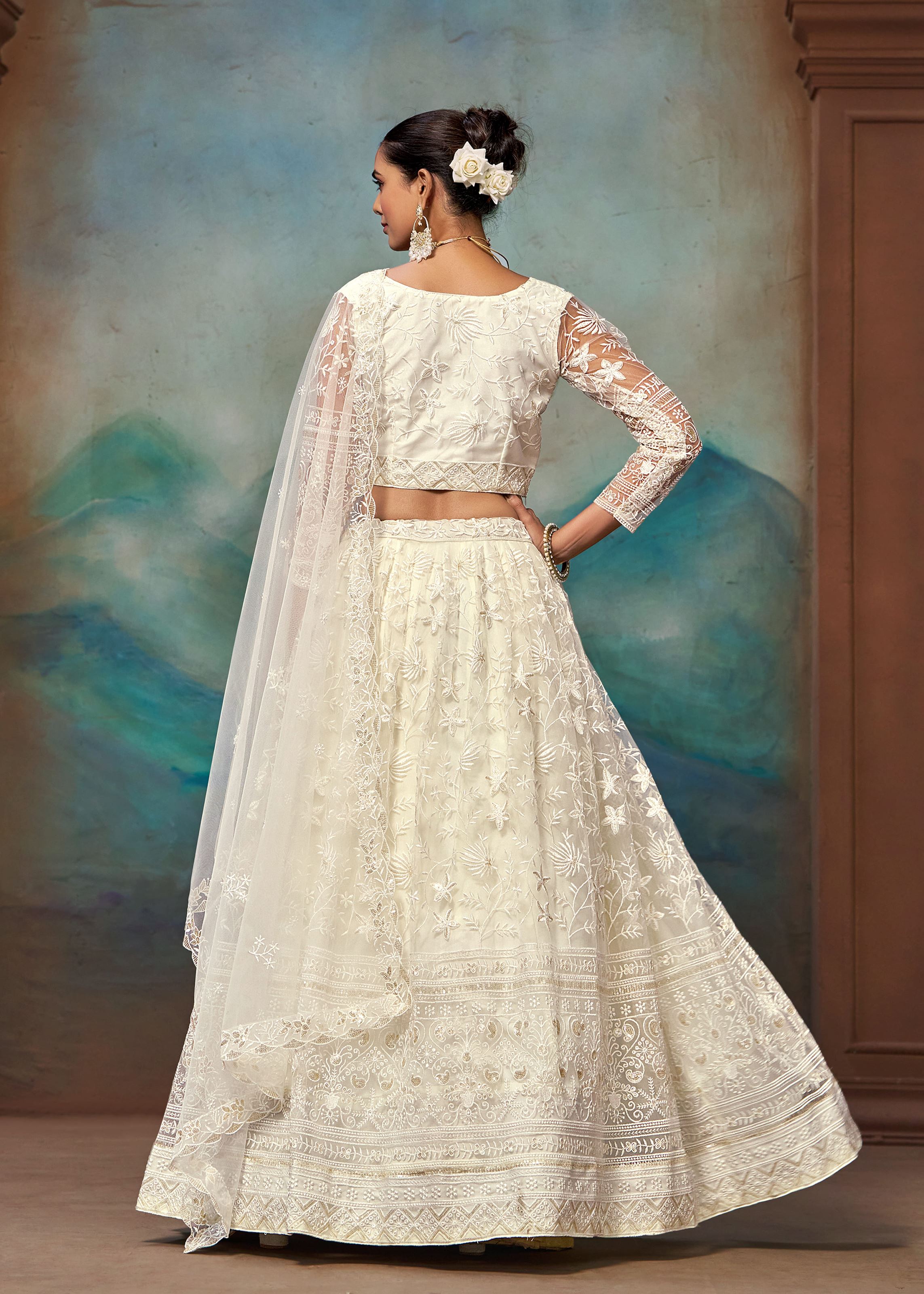 White Net Fabric Thread Embroidery Work Lehenga Choli