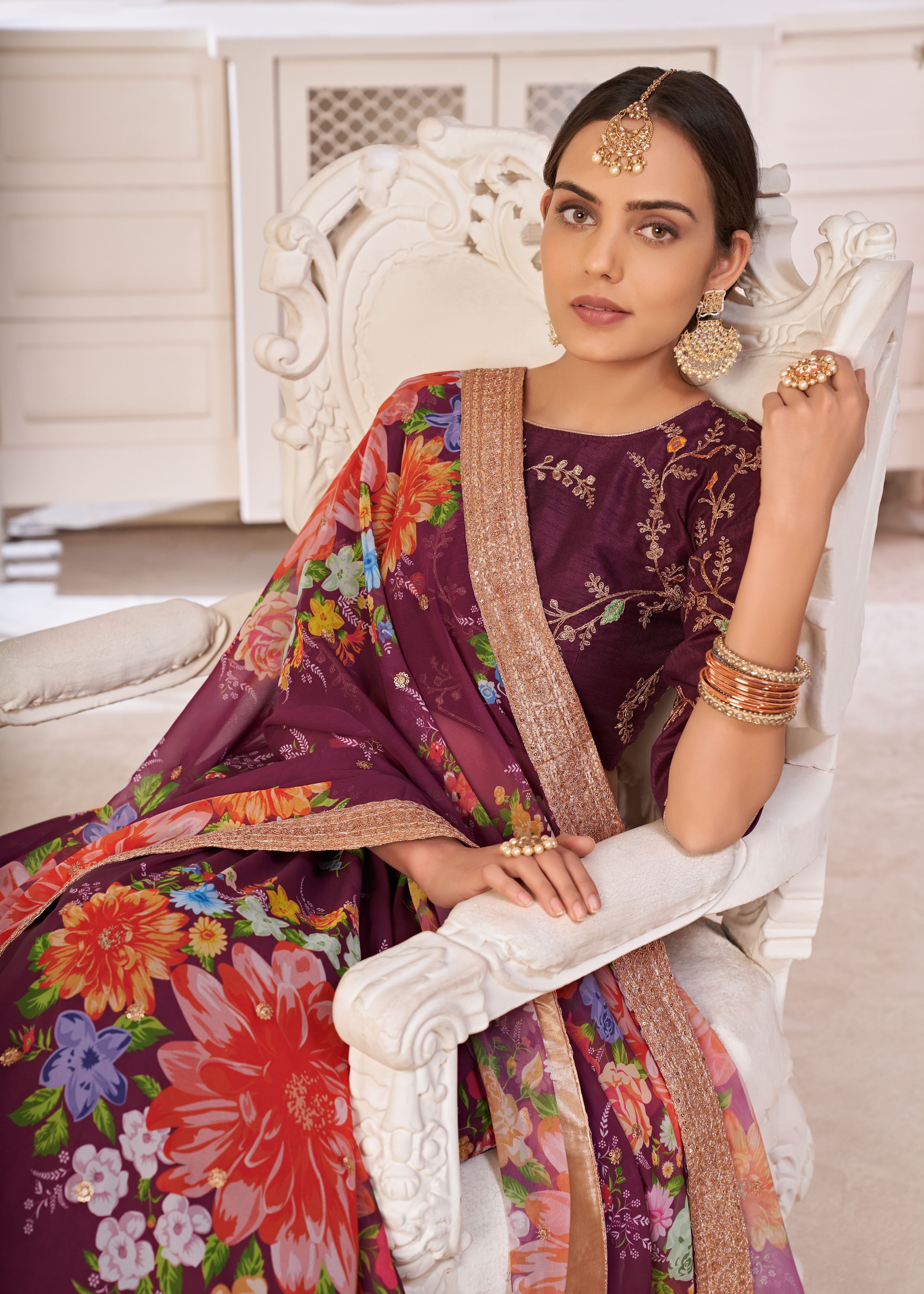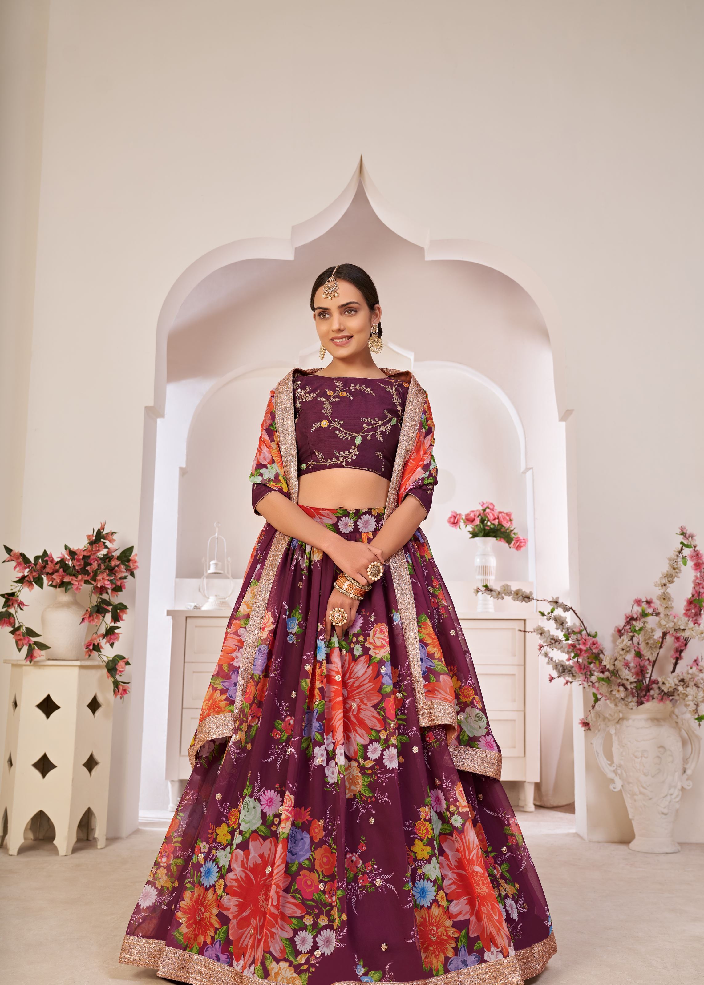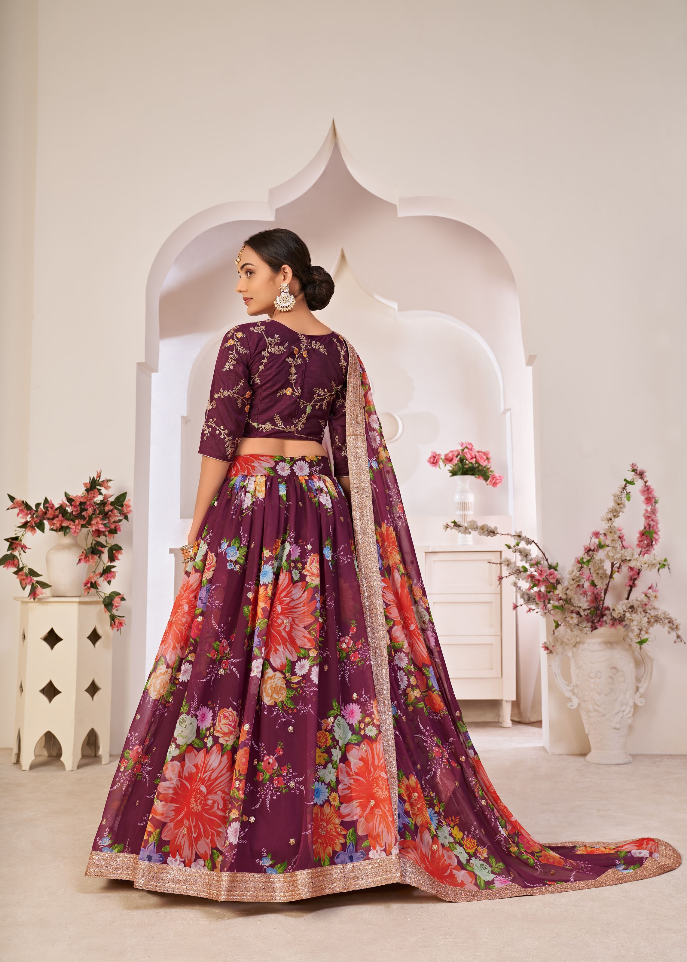 The ensemble is completed with a wine-colored georgette dupatta, showcasing an embroidered border and coordinating digital floral prints, tying the entire outfit together with grace and sophistication. Perfect for weddings, festive celebrations, and special occasions, this lehenga choli offers a blend of tradition and contemporary style.
