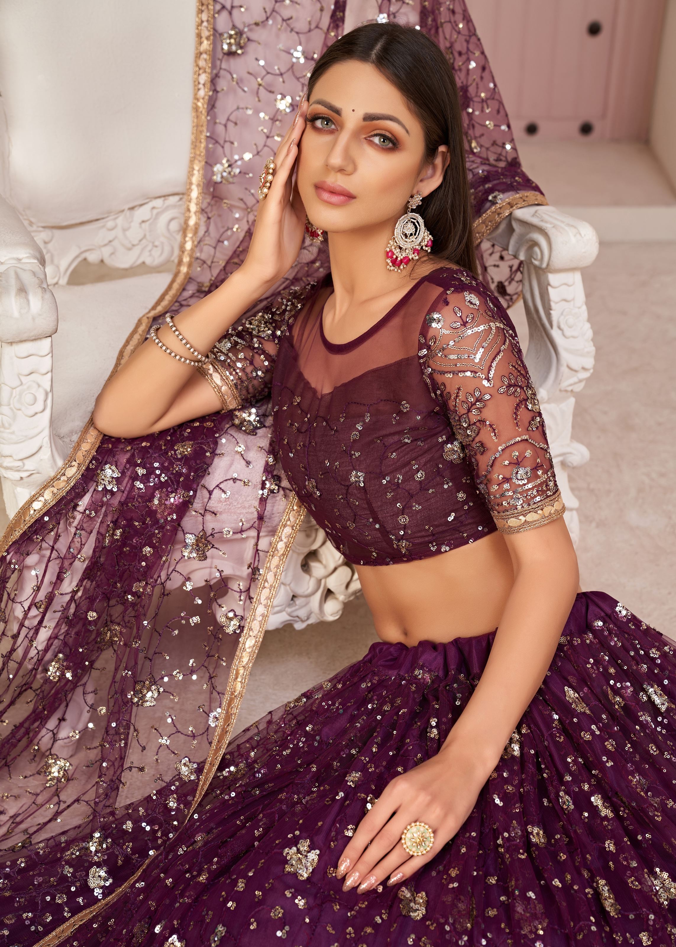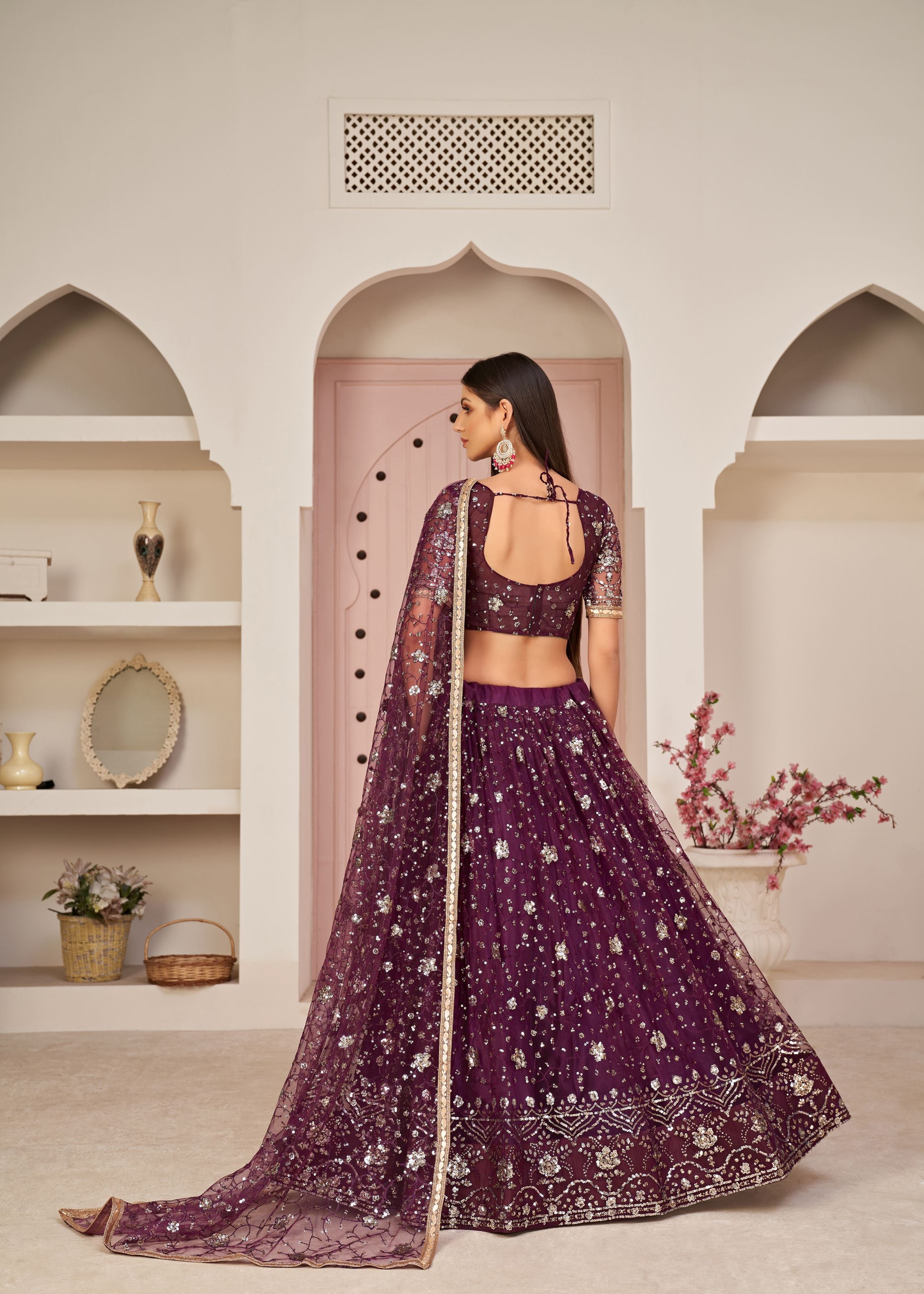 Wine Net Lehenga Choli with Thread Embroidery Work