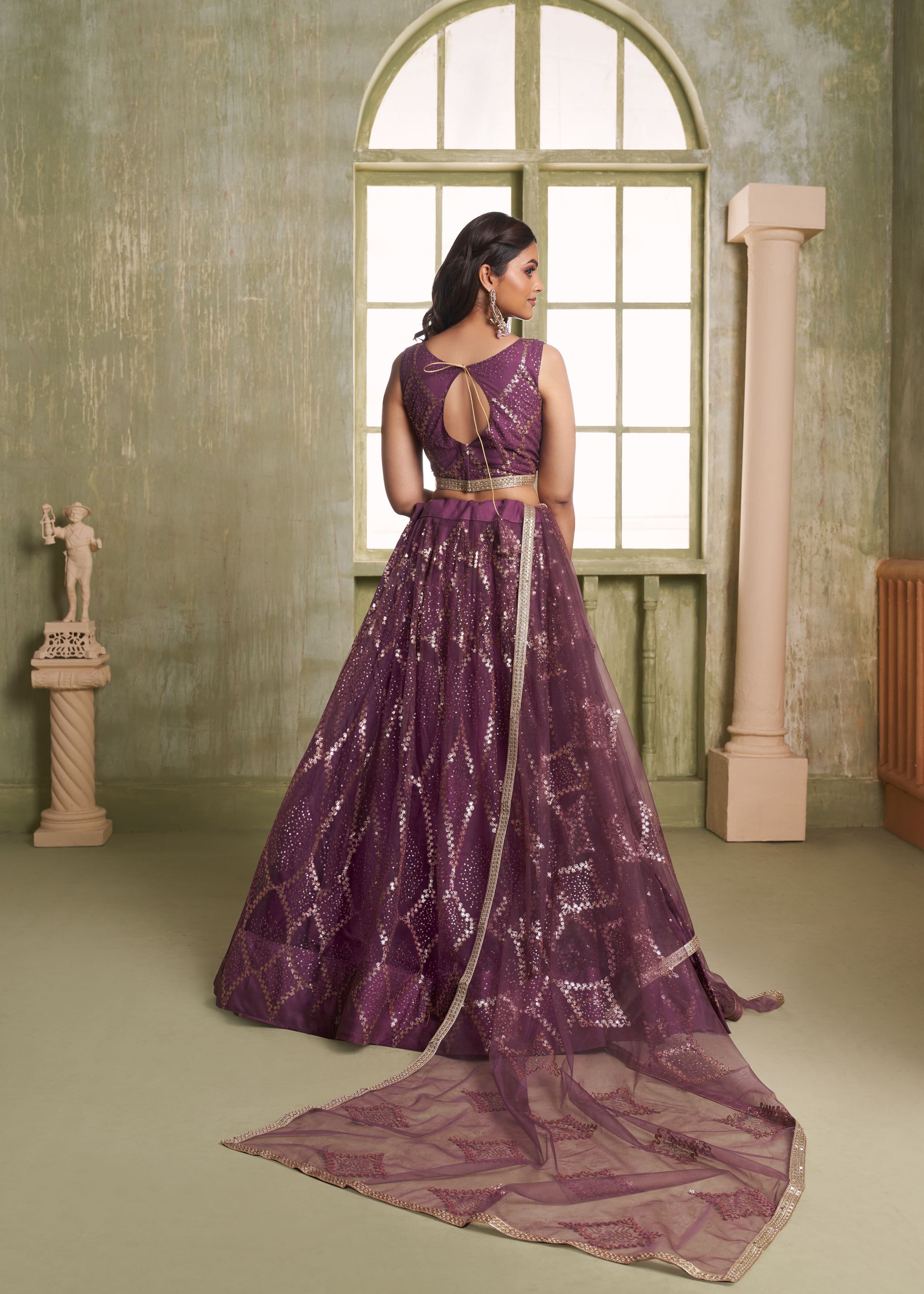 Wine Net Lehenga with Tone-to-Tone Zari Sequence Embroidery