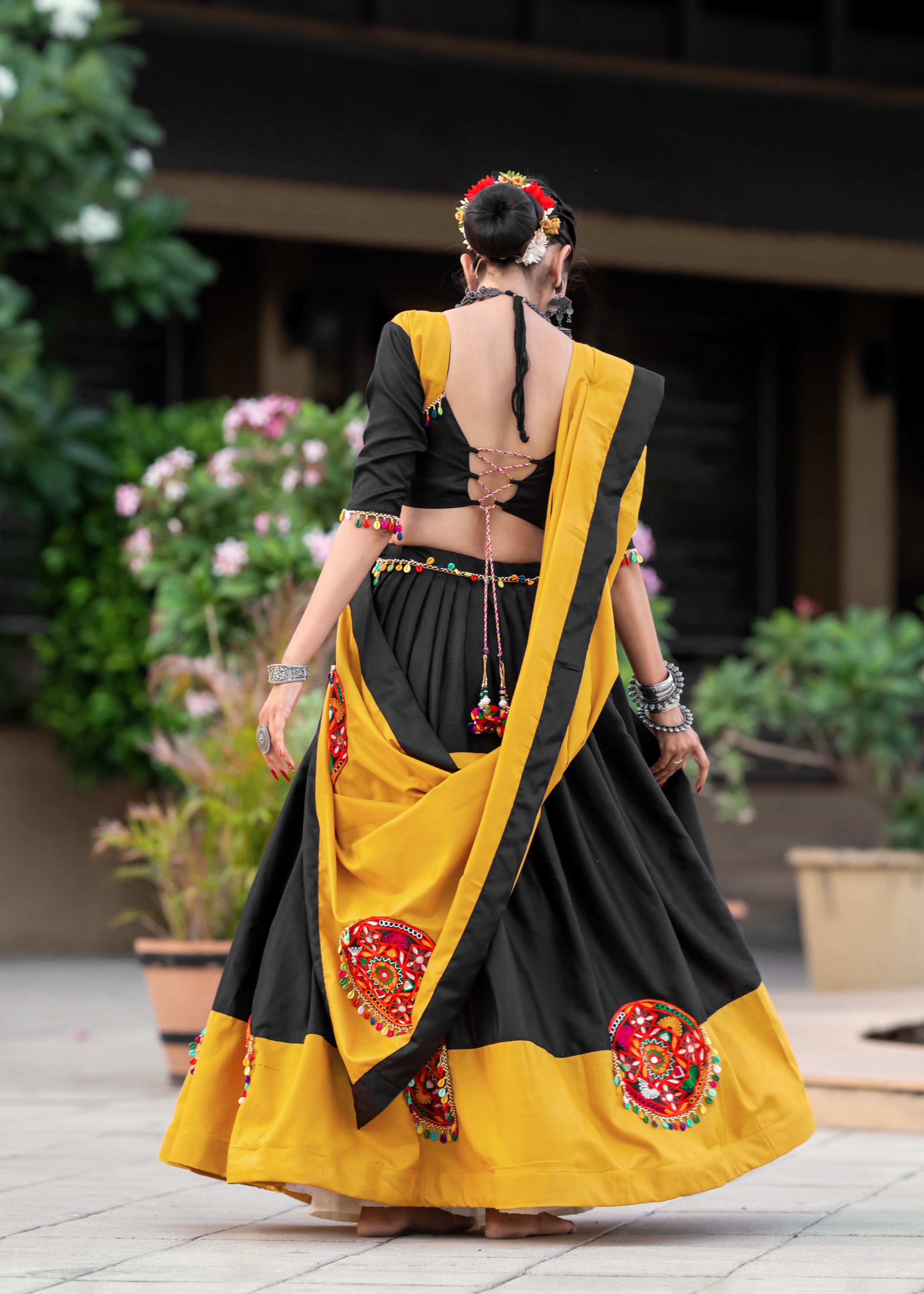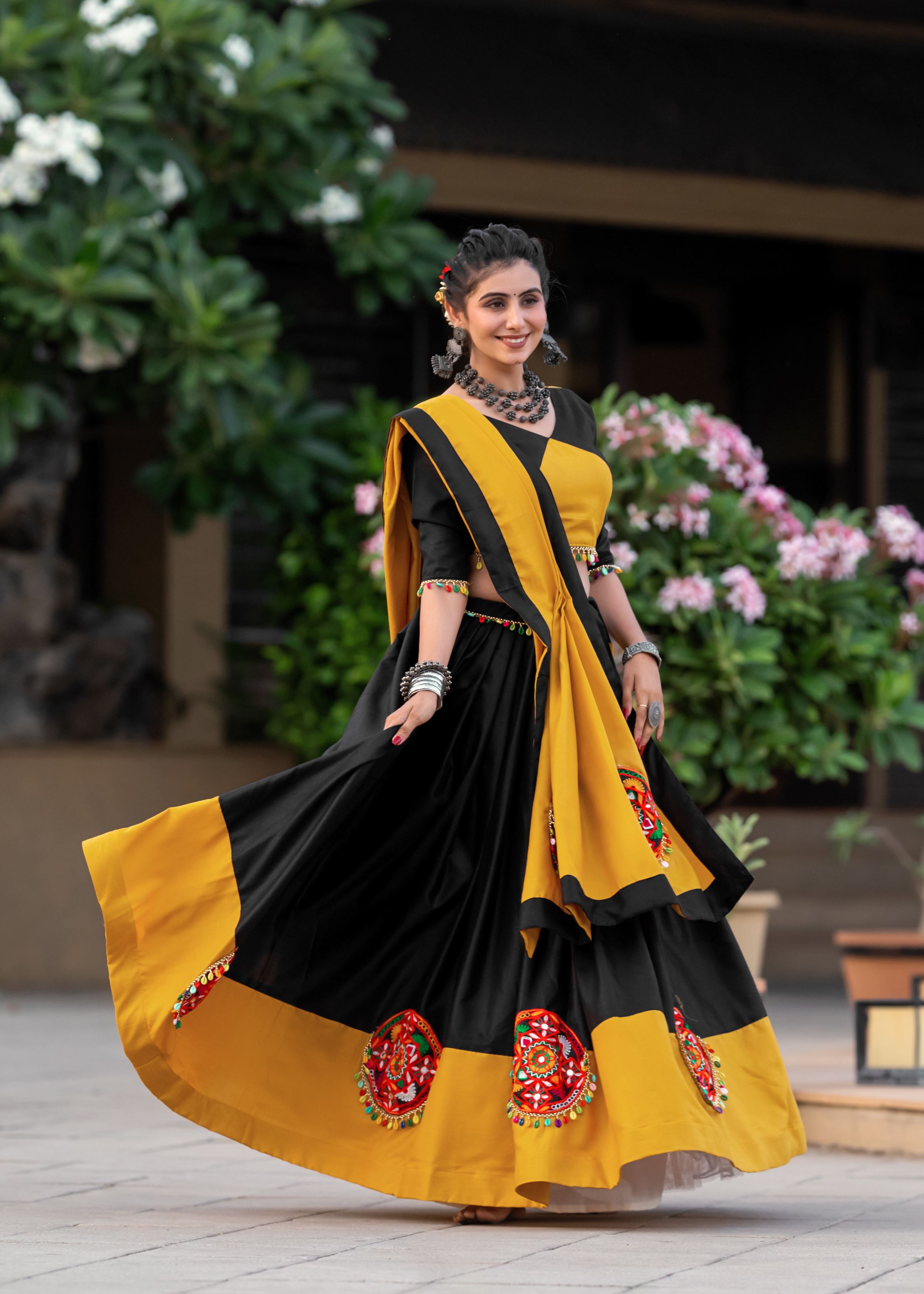 Celebrate the spirit of tradition with this stunning Yellow and Black Navratri Chaniya Choli from Aethnofit Fashions. Expertly crafted from pure cotton, the lehenga and choli feature a deep black hue, beautifully adorned with intricate Gamthi work butta that reflects the rich cultural heritage of Indian craftsmanship. The colorful kodi lace adds a playful and vibrant touch, bringing a festive flair to the outfit.