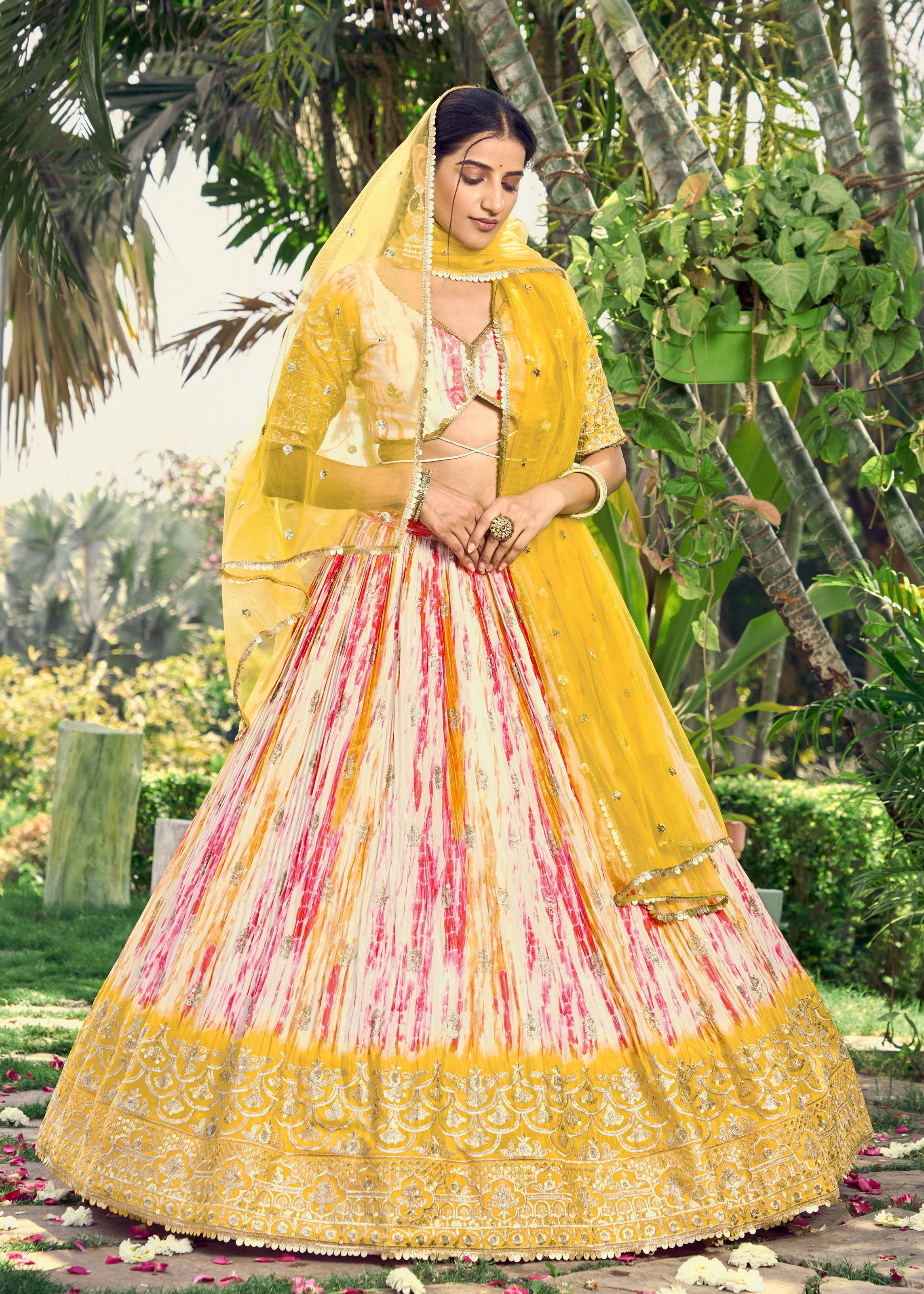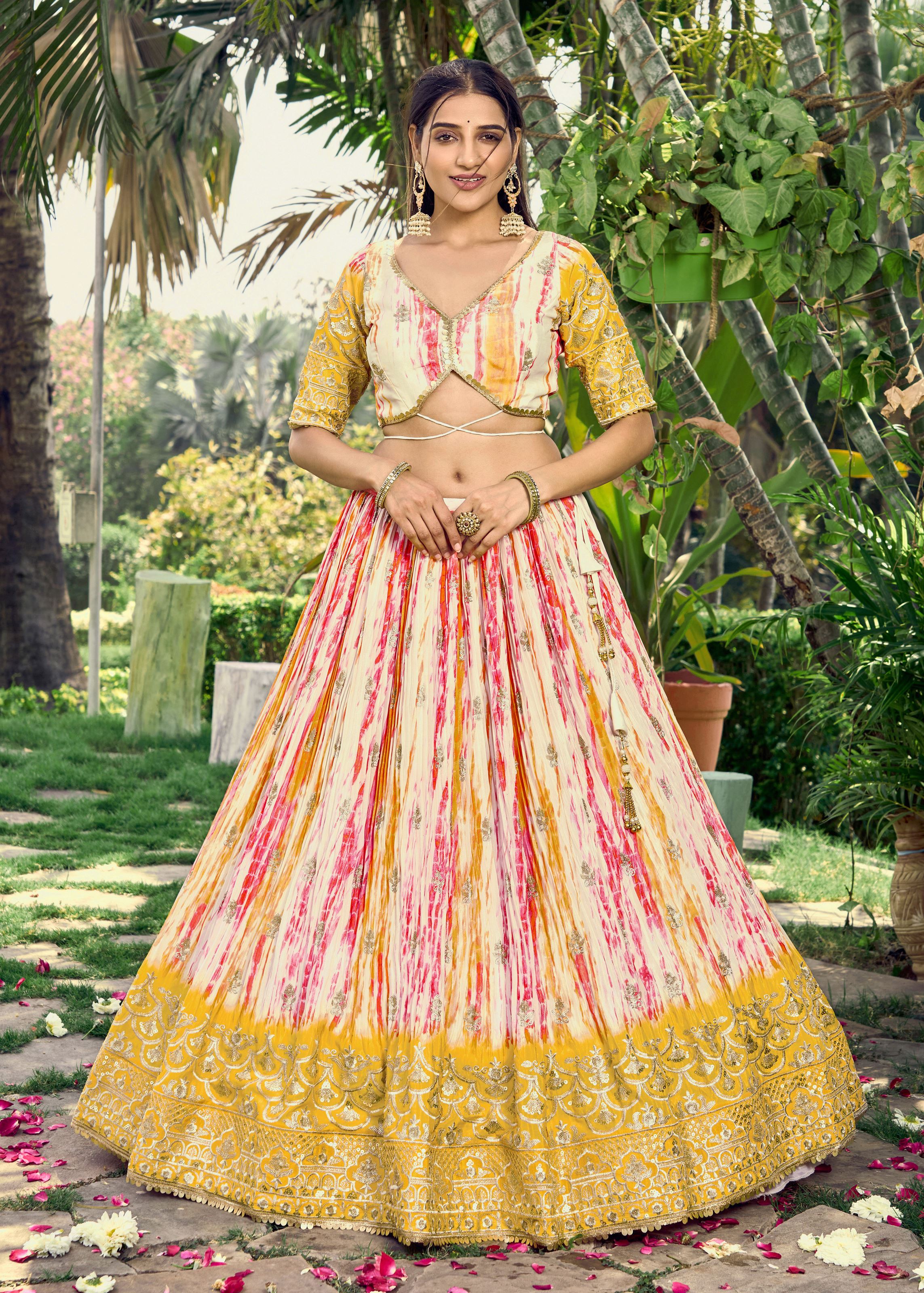 Yellow Chinon Lehenga Choli With Sequins, Zari Embroidery Work with Digital Print --Size Unstitched Available Lehenga Waist And Length Up To 42