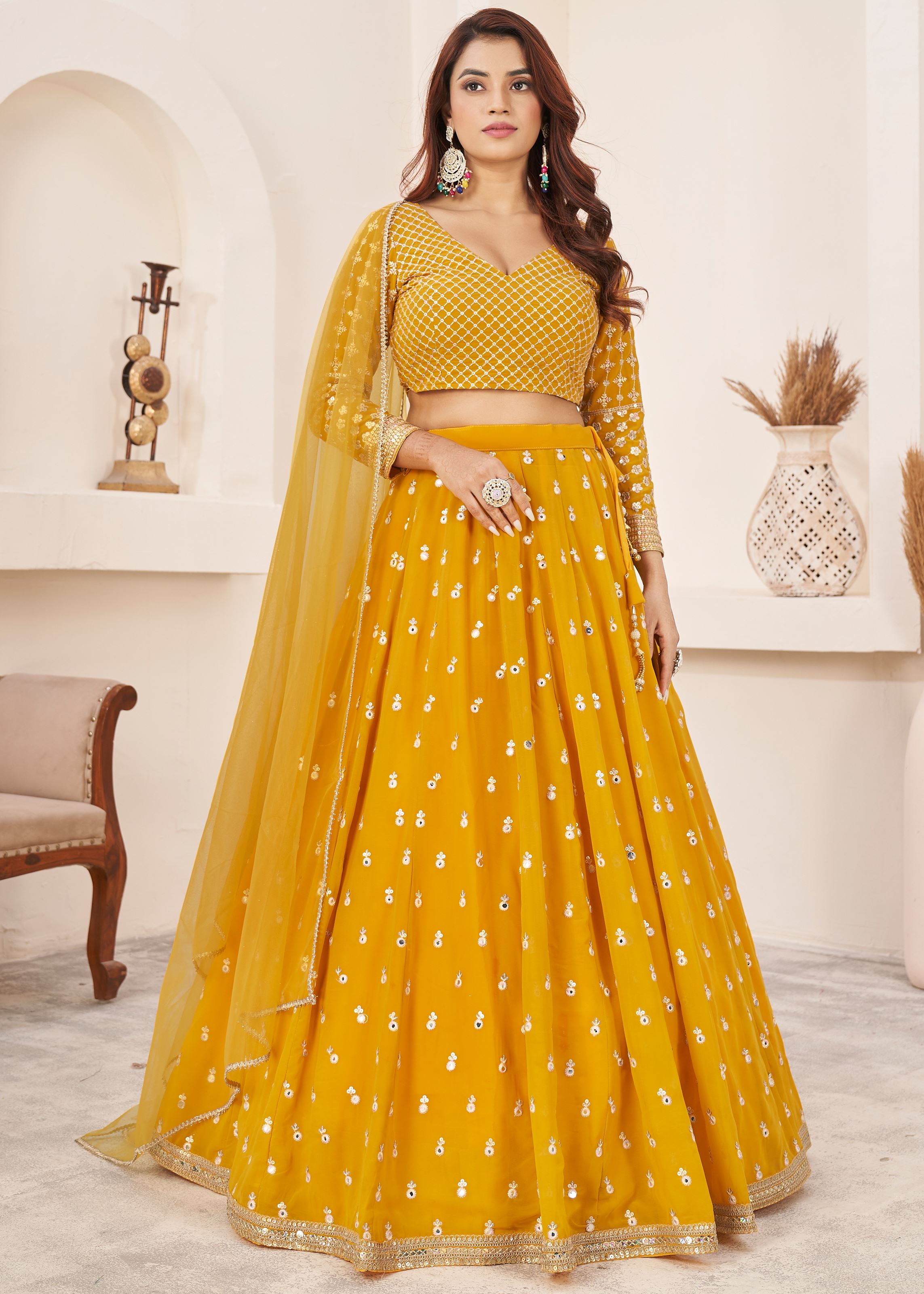 Yellow Georgette Lehenga Choli With Multi Colored Thread with Sequins Embroidered Work --Size Unstitched Available Up To 42 Size