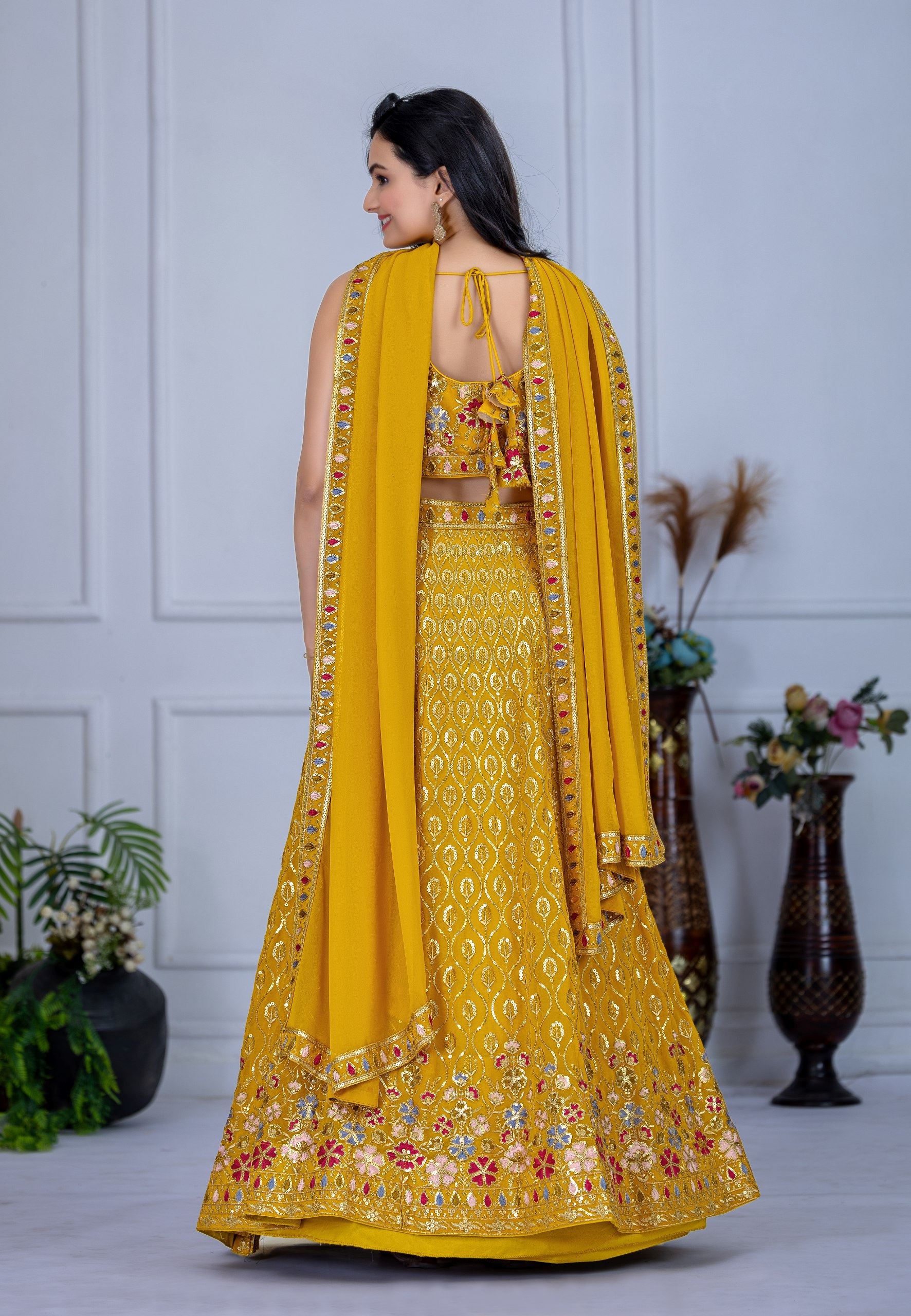 The radiant yellow color symbolizes happiness and new beginnings, making it a go-to choice for traditional occasions. The matching Yellow blouse, designed in soft Georgette, features delicate embroidery that mirrors the lehenga’s intricate detailing. To complete the look, a Yellow Georgette dupatta is included, offering a graceful drape that adds softness and sophistication to the outfit.