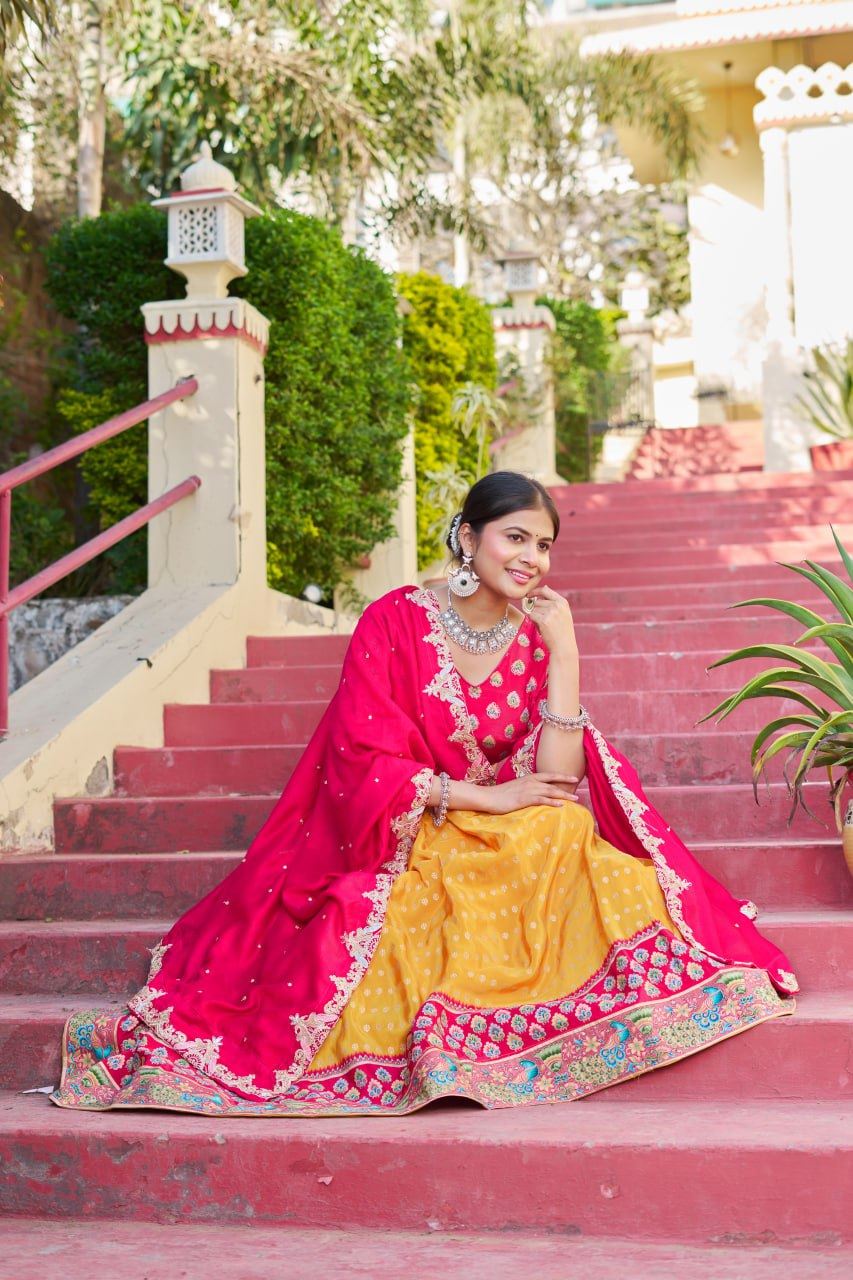 The cheerful yellow tone brings energy and joy—making it a perfect pick for haldi functions, festive pujas, and day-time celebrations. The matching Jacquard blouse complements the lehenga with subtle detailing and a clean, elegant silhouette. A soft Yellow Silk dupatta completes the set, adding contrast with a luxurious sheen and lightweight drape.