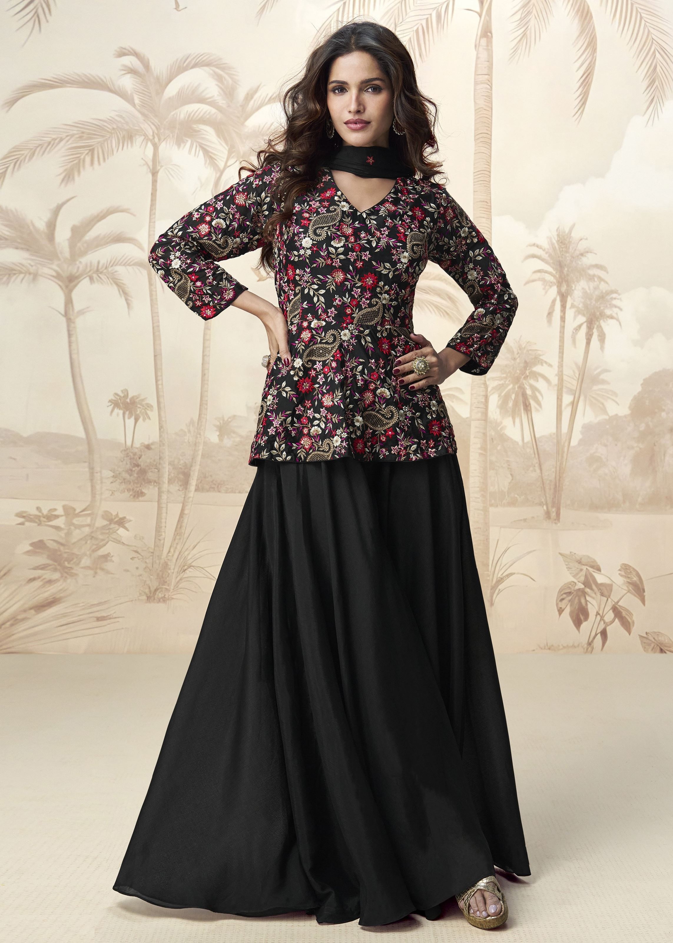 The deep black hue symbolizes power, elegance, and mystery, making this ensemble a standout choice for evening occasions, festive functions, and weddings. Paired with a matching Chinon bottom, it offers both comfort and a seamless look. The matching Chinon dupatta completes the ensemble with fluid draping and detailed embroidery, adding a layer of refinement.
