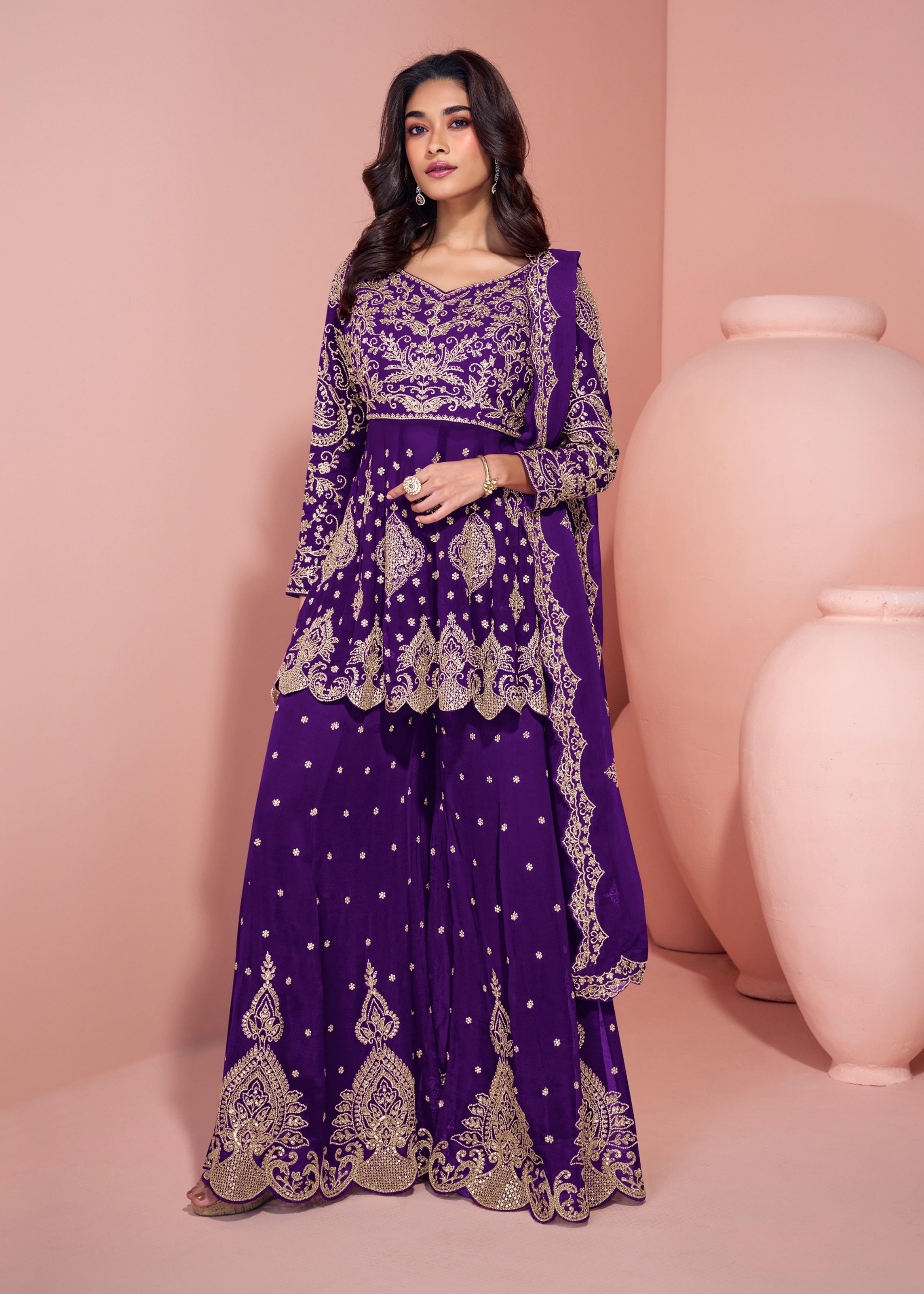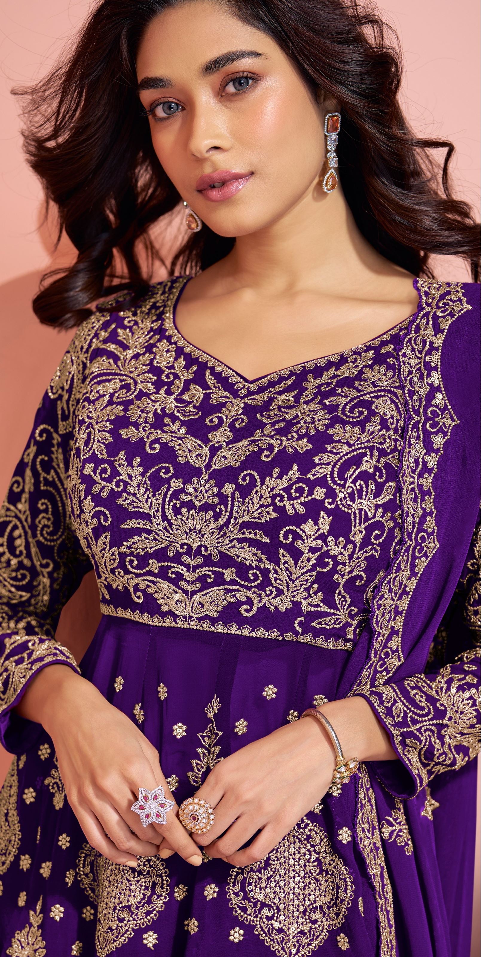 The highlight of this ensemble is its heavy embroidery work, showcasing traditional craftsmanship with a modern twist. Whether you're dressing for a festive celebration, a formal evening, or a pre-wedding function, the flowing silhouette and ornate details make this suit a stunning choice. The lightweight georgette ensures comfort while offering a graceful drape that flatters every body type.