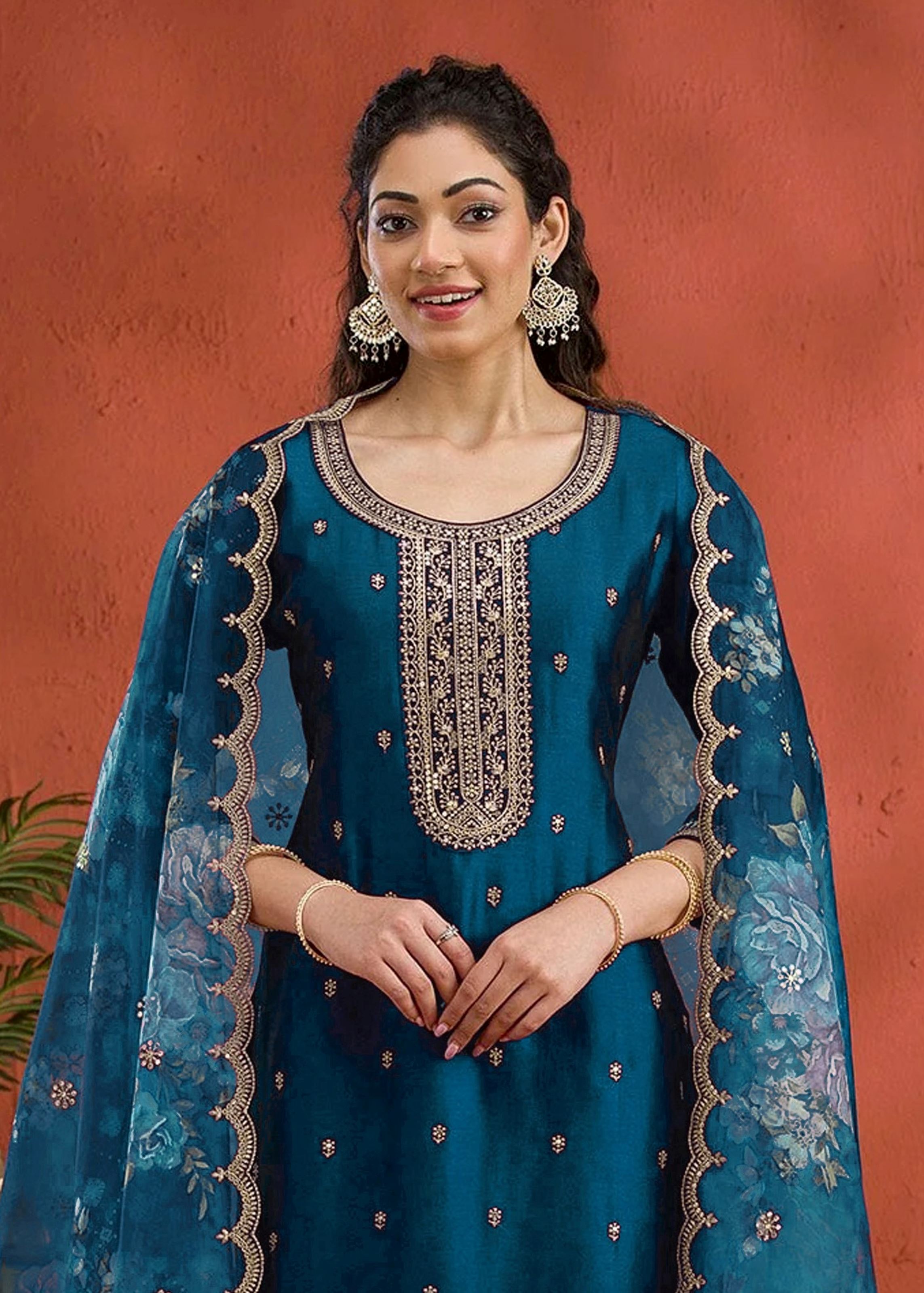 Complementing the top is a comfortable Santoon fabric bottom, dyed in the same majestic blue for a seamless, coordinated look. Completing the set is a lightweight organza dupatta, beautifully finished with embroidered accents that lend a graceful, airy finish to the outfit.