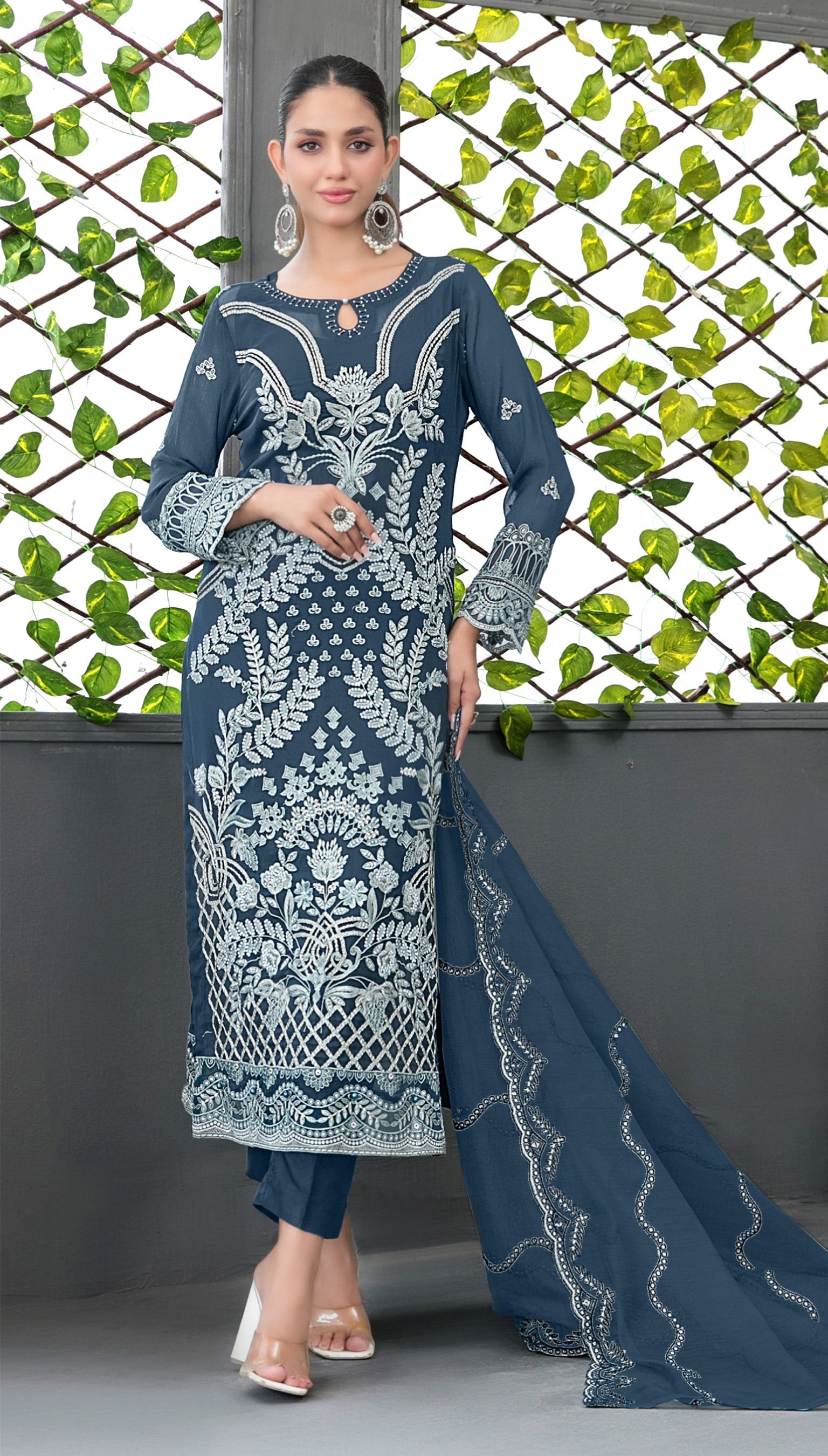 Make a statement of timeless elegance with this Blue Heavy Designer Suit, a captivating ensemble designed for today’s modern yet traditional woman. Crafted from premium faux georgette, the 46-inch kameez features intricate heavy embroidery work, creating a rich, ornate look that reflects regal charm and fine craftsmanship.
