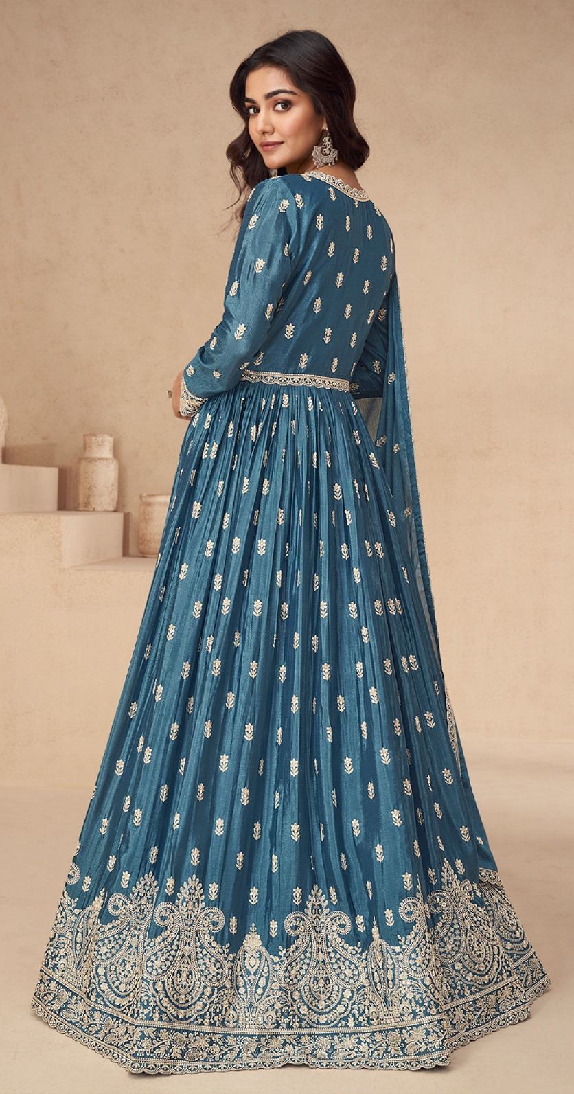 Turn heads with timeless grace in this Blue Heavy Designer Suit, a rich and regal ensemble designed to elevate your ethnic wardrobe. The elegant Chinon kameez, in a deep blue hue, features intricate heavy embroidery work that showcases fine craftsmanship and adds a luxurious texture to the flowing fabric. With a stately 56-inch top length, the silhouette exudes sophistication and charm, making it a perfect pick for grand events, weddings, or festive evenings.