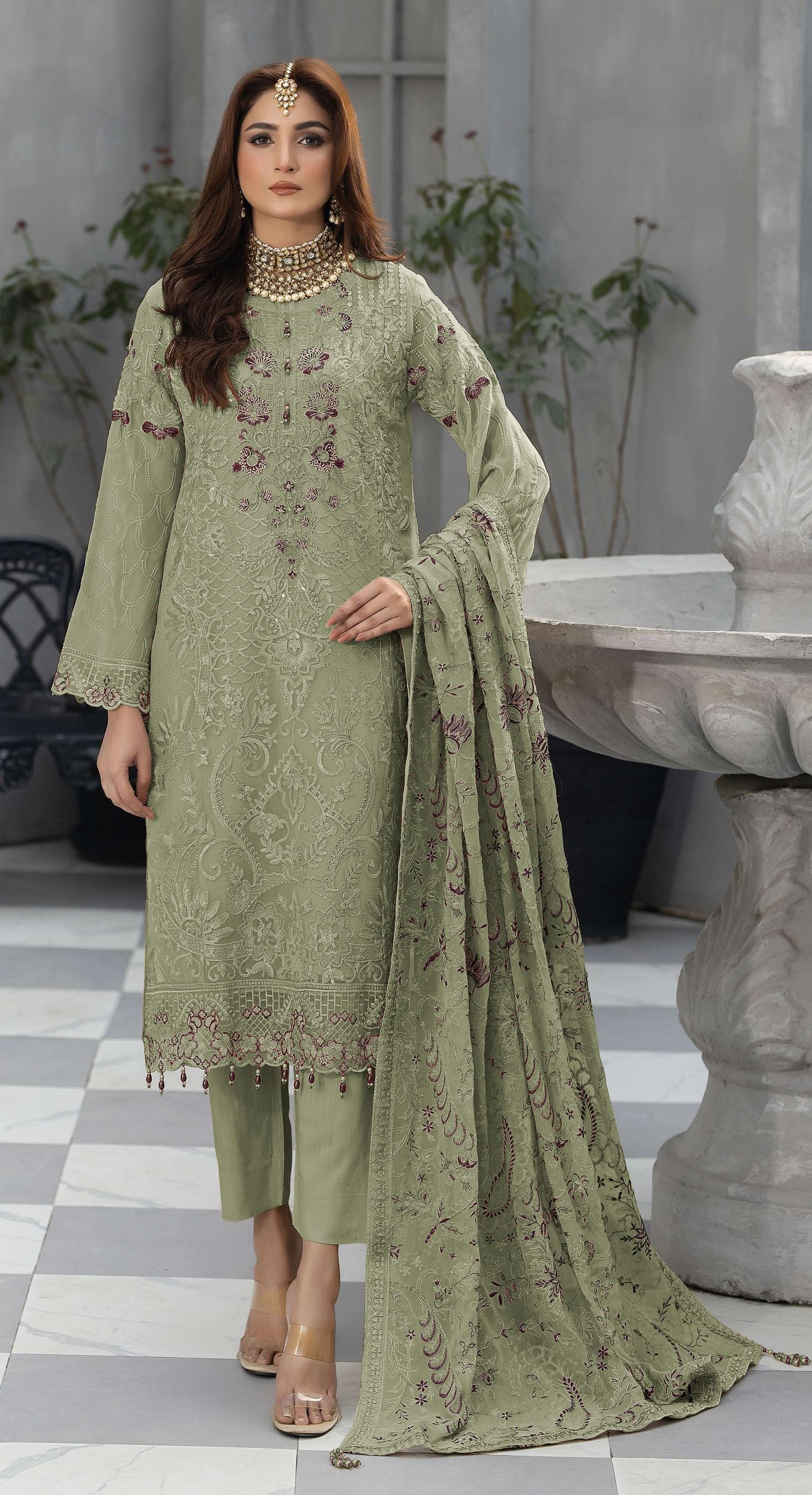 The ensemble includes a matching Santoon bottom that offers both comfort and structure, perfectly complementing the flowing top. The coordinated Faux Georgette dupatta adds a graceful finish, enhanced with subtle embroidery that ties the entire look together in harmony.