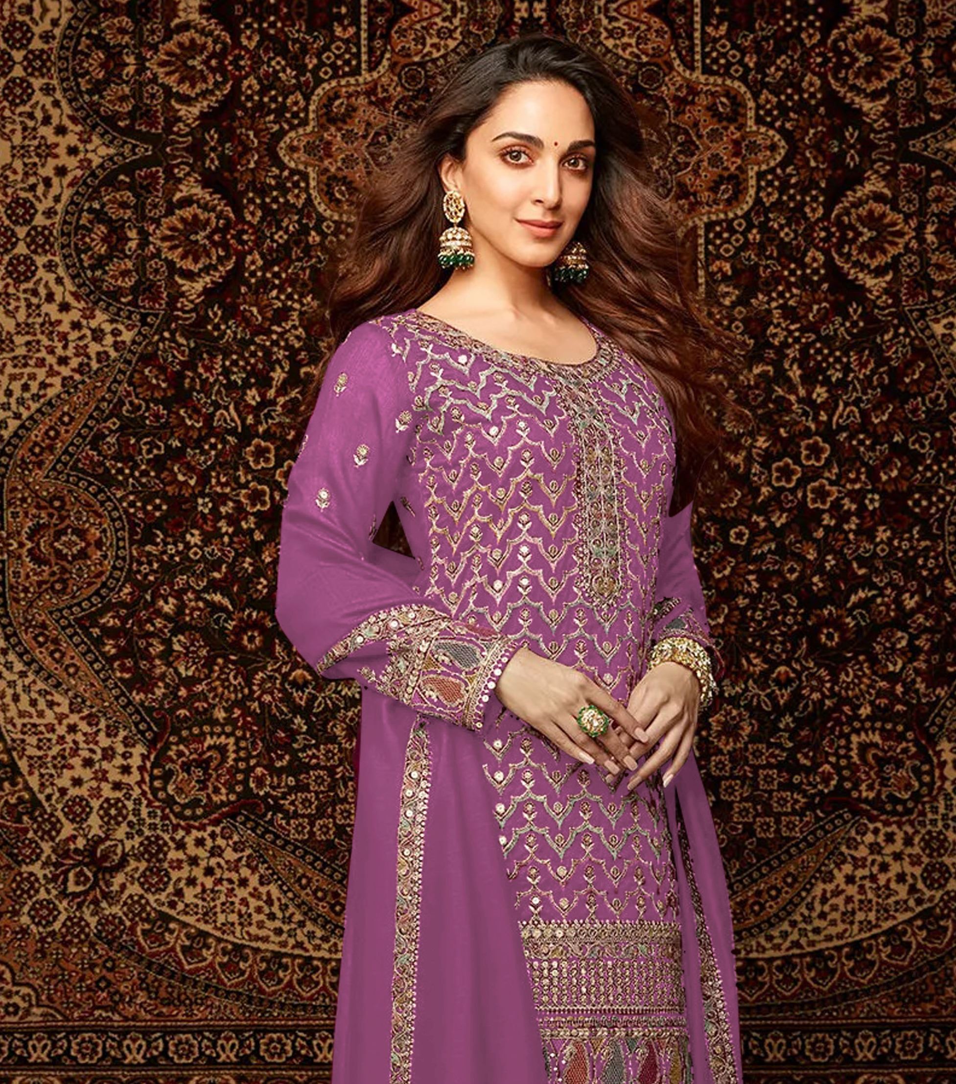 This three-piece ensemble is paired with a Santoon bottom and a flowing Chinon dupatta, all in matching light purple shades. The soft pastel hue enhances its feminine appeal, while the lightweight fabrics ensure day-long comfort and effortless movement. It’s a go-to choice for weddings, festive events, or even statement office wear.