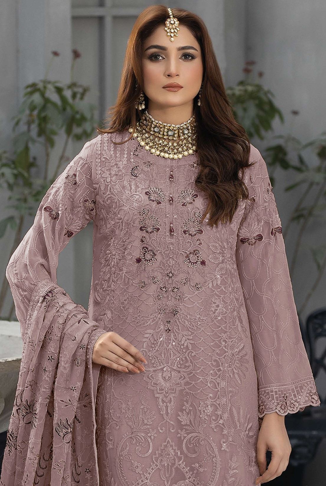 Radiate refined elegance in this Mauve Heavy Designer Suit, a perfect blend of rich tradition and contemporary style. Crafted from premium Faux Georgette, the kameez boasts a flattering 46-inch length, adorned with intricate heavy embroidery work that adds depth, dimension, and designer flair to your ethnic wardrobe.