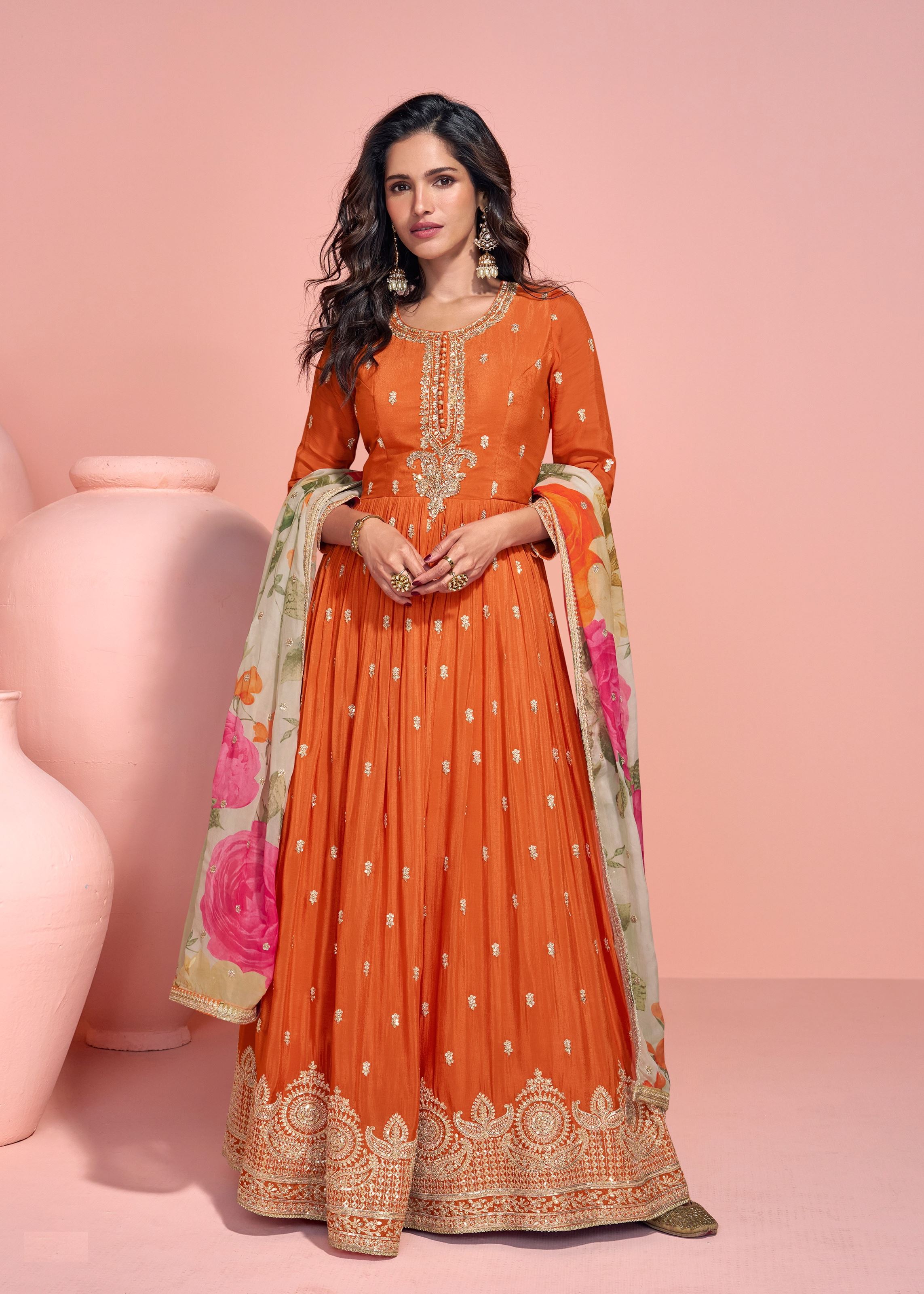 Infuse your ethnic wardrobe with vibrant charm and elegance through this Orange Heavy Designer Suit from Aethnofit Fashions. Crafted from high-quality Chinon fabric, the stunning 56-inch kameez is adorned with detailed heavy embroidery work that adds depth, sophistication, and festive flair. The bright orange hue radiates warmth and celebration, making it a striking choice for haldi ceremonies, wedding functions, festivals, or statement daywear.