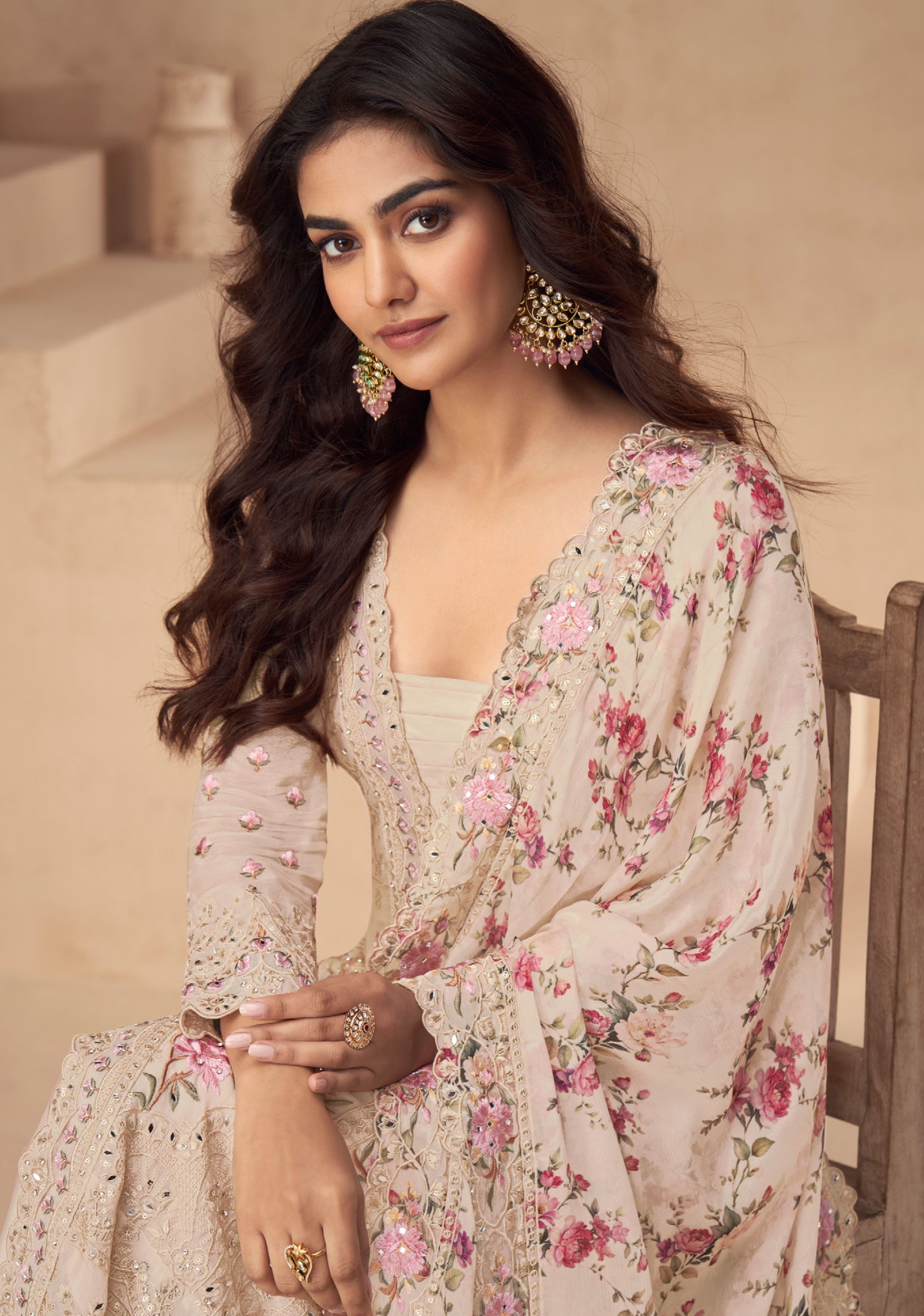 Perfect for weddings, festive gatherings, or formal events, this designer suit embodies understated glamour. The detailed embroidery adds visual texture, making it a standout piece without overpowering your personal style. Style it with traditional jhumkas or pearl accessories to complete the look.
