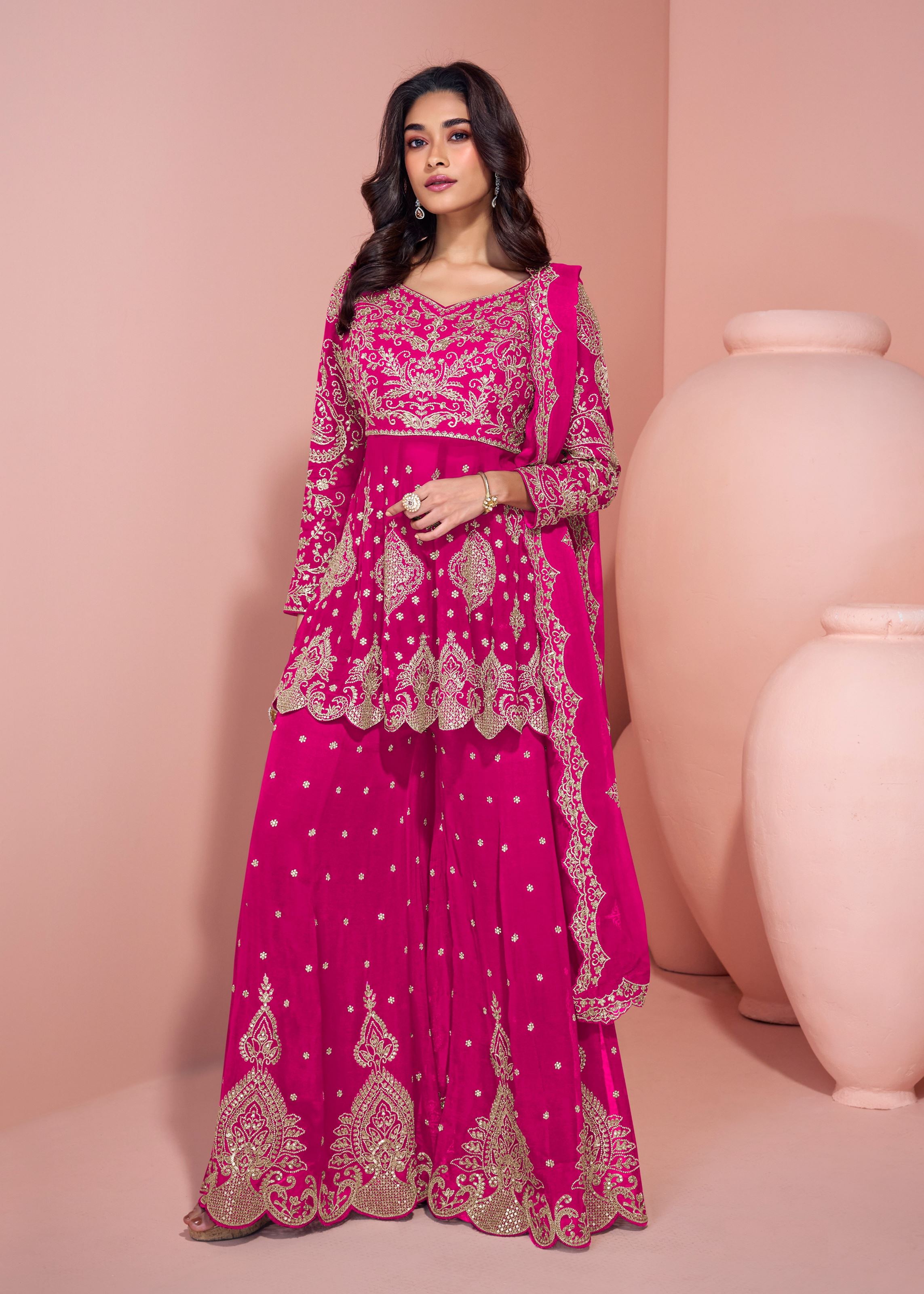 Bring timeless beauty and vibrant elegance to your ethnic wardrobe with this Pink Heavy Designer Suit from Aethnofit Fashions. Crafted from luxurious Georgette fabric, this stunning ensemble features a 38-inch kameez, matching bottoms, and a soft, drapey dupatta — all in a captivating pink hue that radiates charm and celebration.