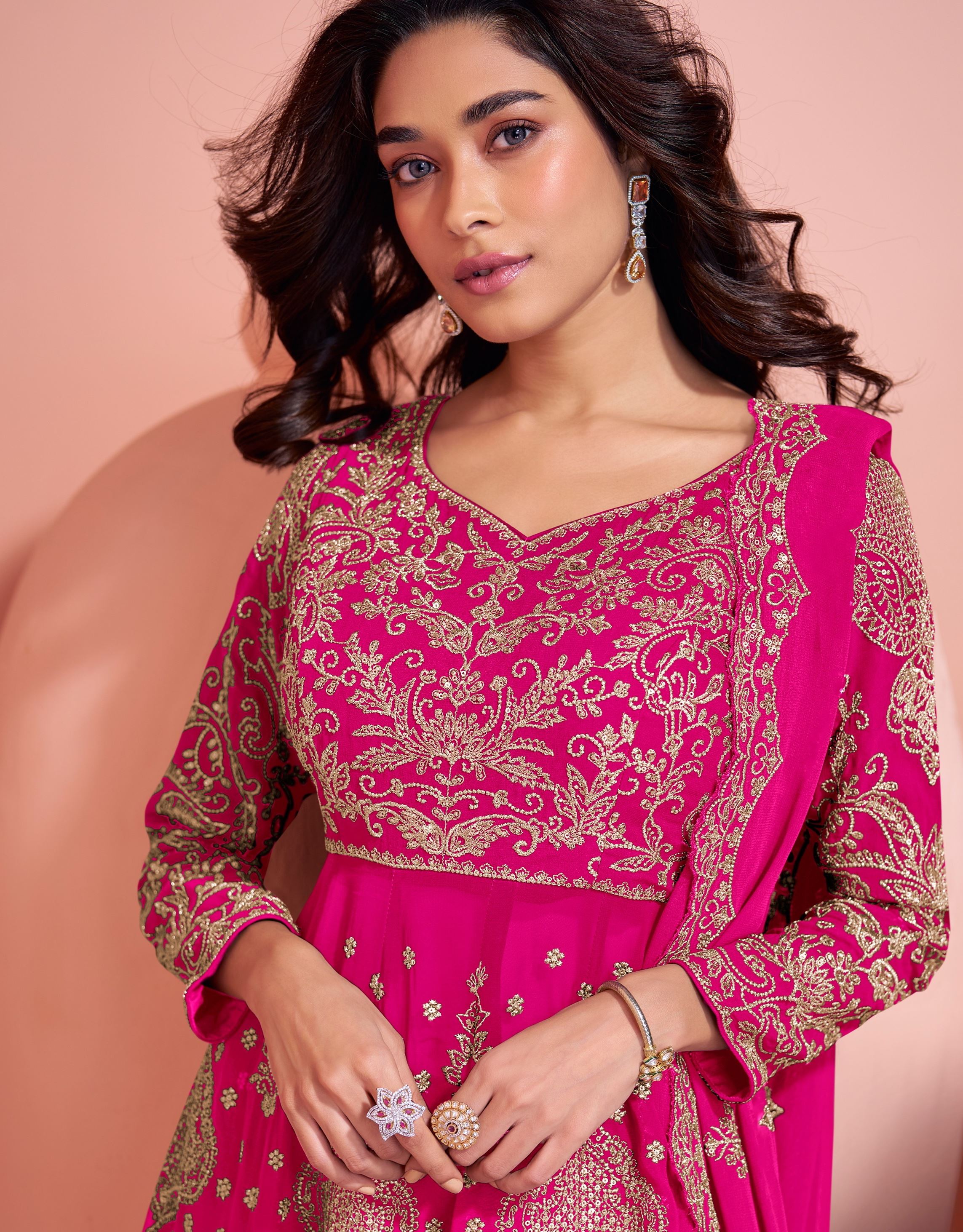 The highlight of the outfit is its intricate heavy embroidery work, which adds depth, texture, and a festive sparkle to the overall look. Whether you’re attending a daytime celebration, engagement party, or family gathering, this pink suit strikes the perfect balance between tradition and trend. The lightweight georgette ensures comfort, movement, and a flattering fall — making it a joy to wear from morning rituals to evening receptions.