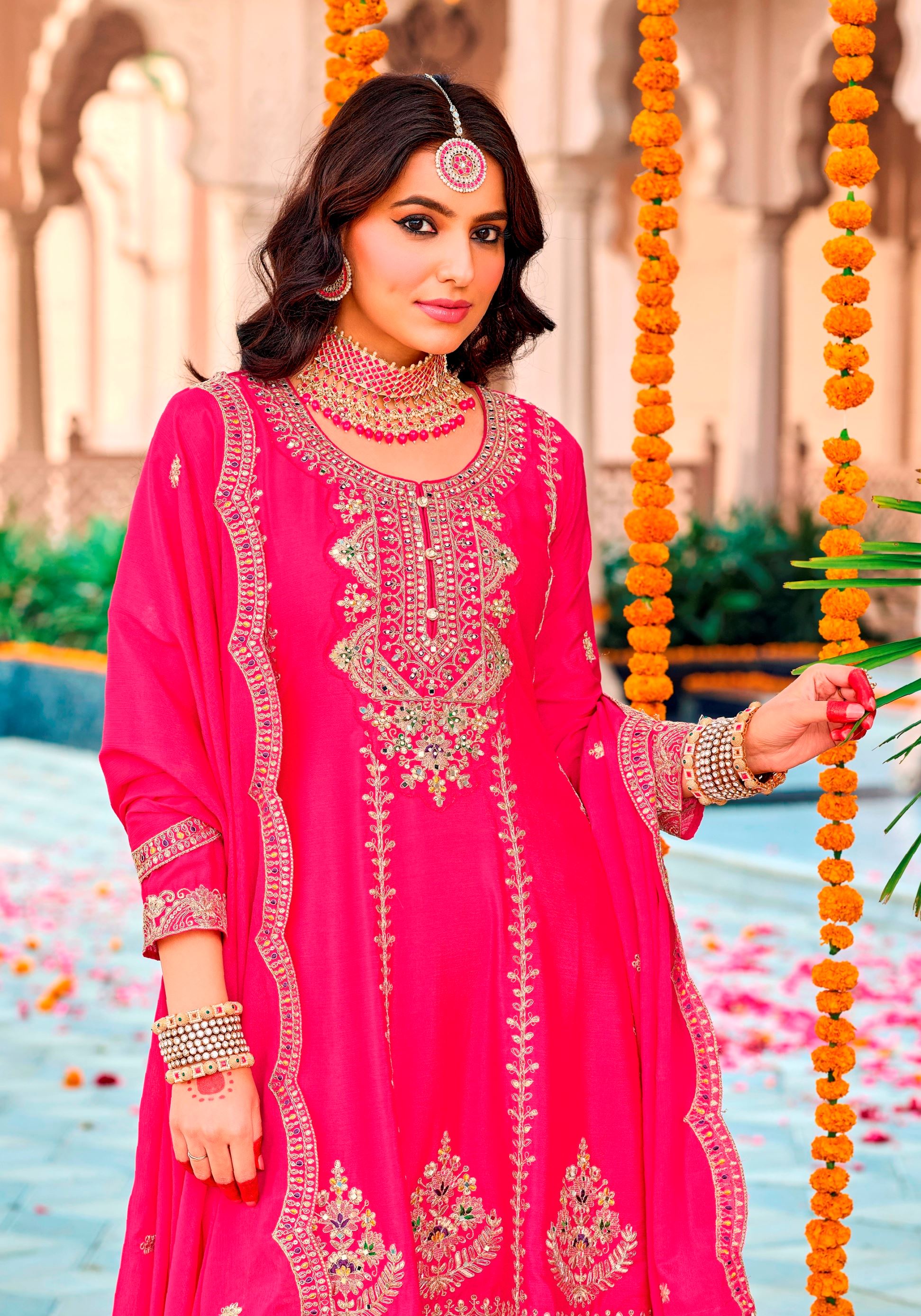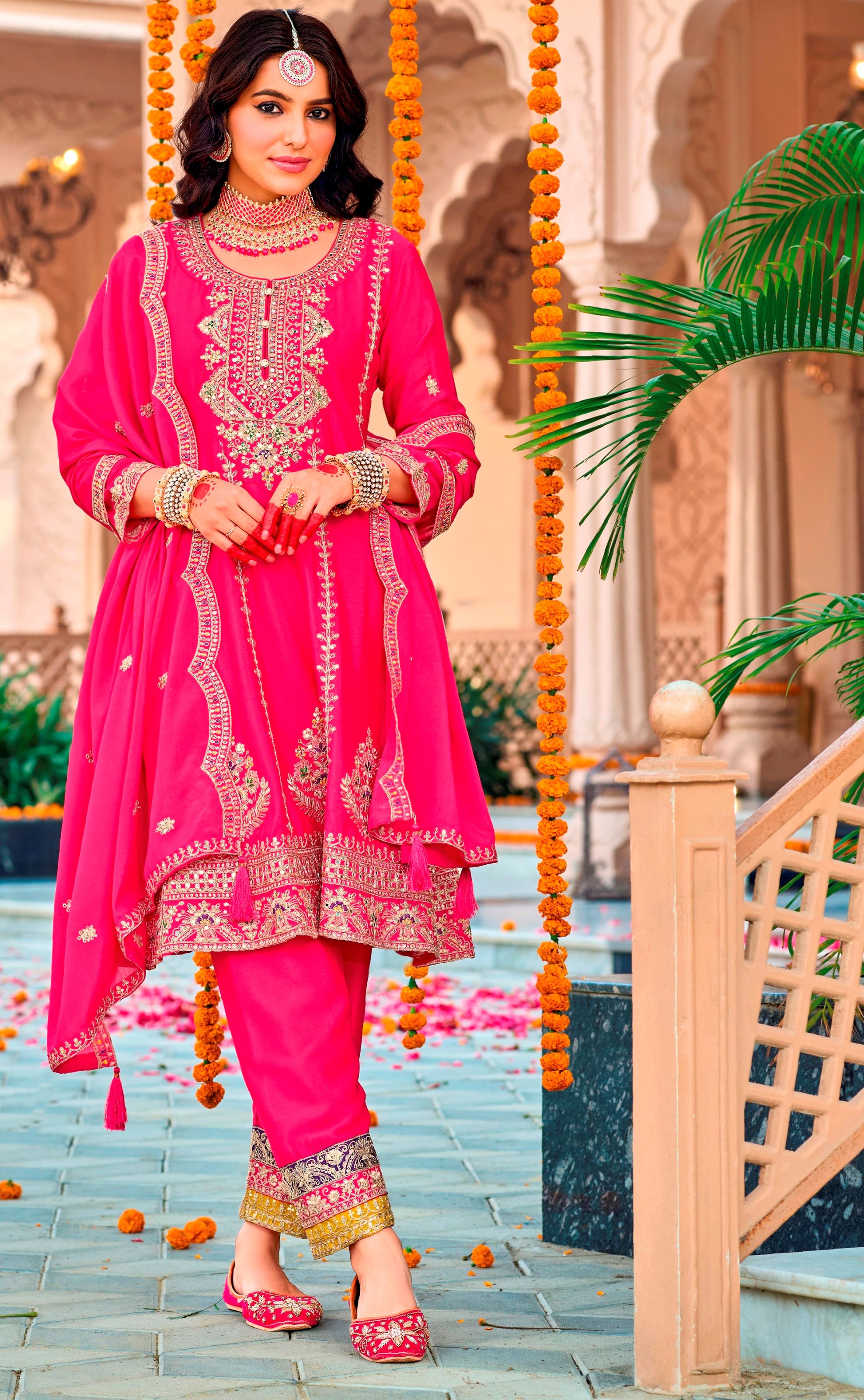 Radiate charm and sophistication with this Pink Heavy Designer Suit, a perfect fusion of traditional elegance and contemporary grace. Crafted from premium Chinon fabric, the kameez drapes beautifully and ensures comfort without compromising on style. The soft, feminine pink hue is enriched with intricate embroidery work, adding depth and finesse to the outfit—ideal for festive occasions, wedding functions, and special celebrations.