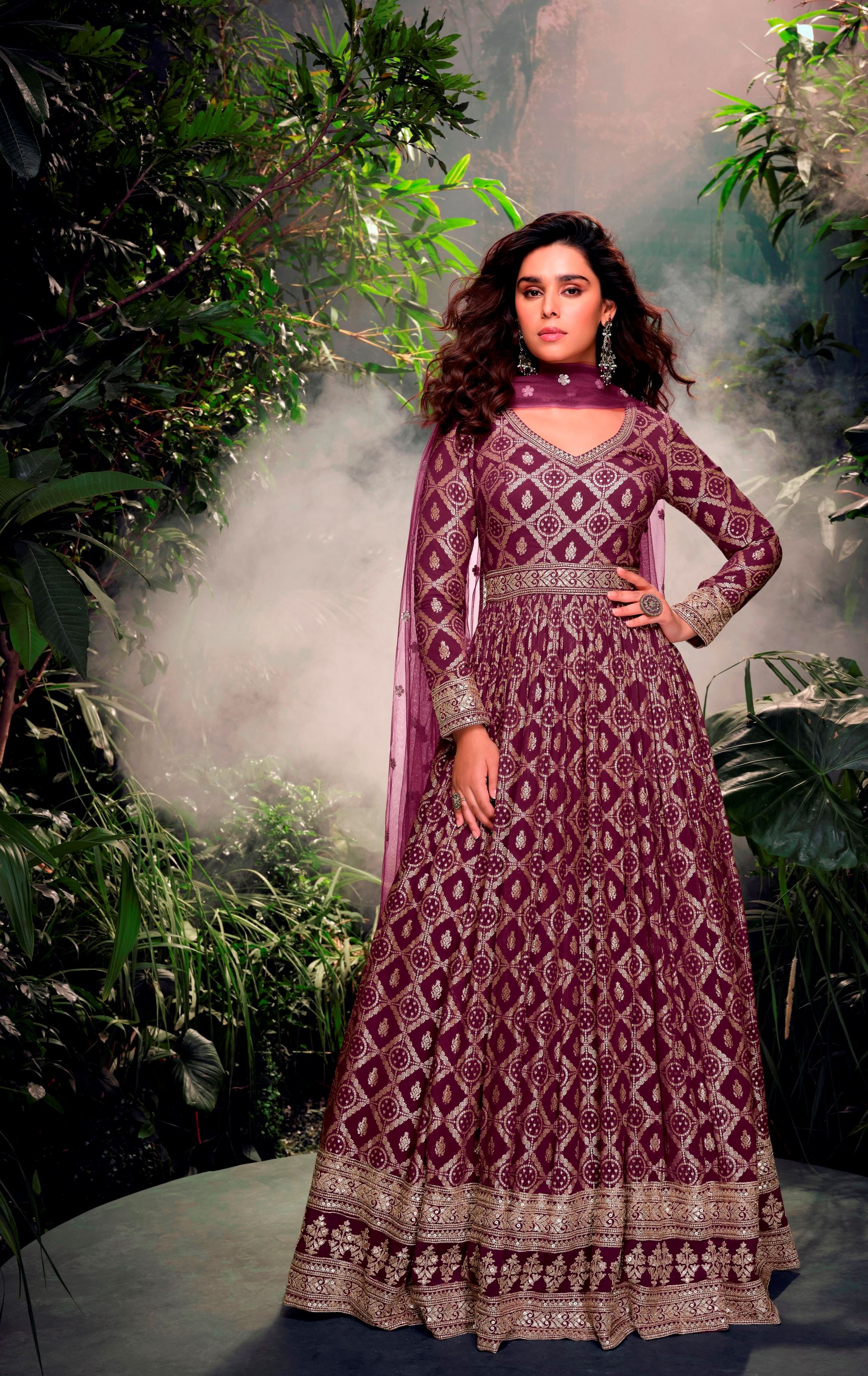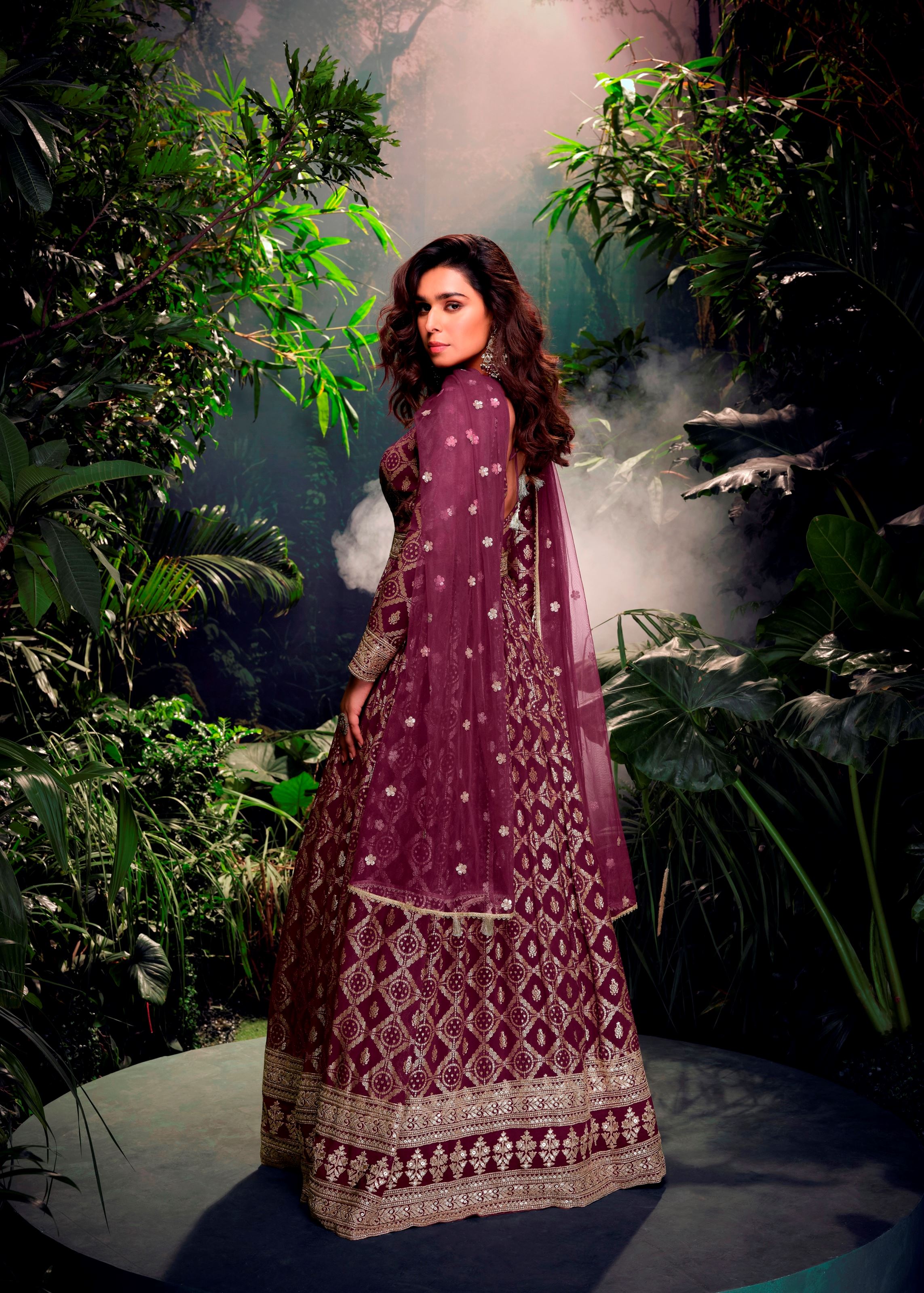 Make a statement at every occasion with the exquisite Purple Anarkali Suit from Aethnofit Fashions. Crafted from luxurious jacquard fabric, the top of this suit features a rich texture that adds depth and elegance to the overall silhouette. Complemented by a delicate purple net dupatta, the ensemble offers a perfect blend of traditional grace and modern style.