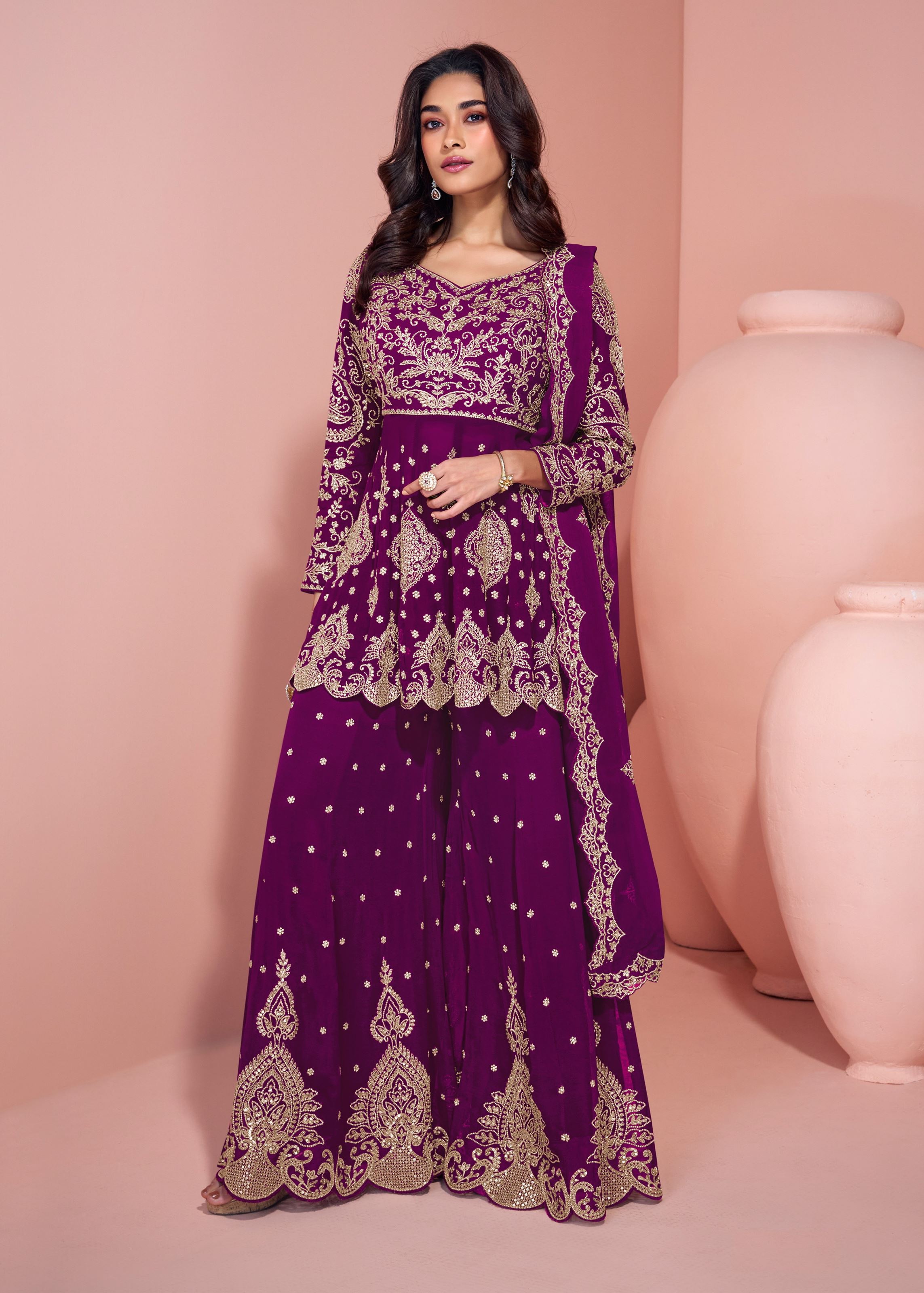 Drape yourself in elegance and grace with this Purple Heavy Designer Suit from Aethnofit Fashions — a stunning georgette ensemble designed to reflect regal charm and festive beauty. The set includes a 38-inch kameez, matching bottoms, and a soft georgette dupatta, all in a majestic purple hue that flatters every complexion and occasion.