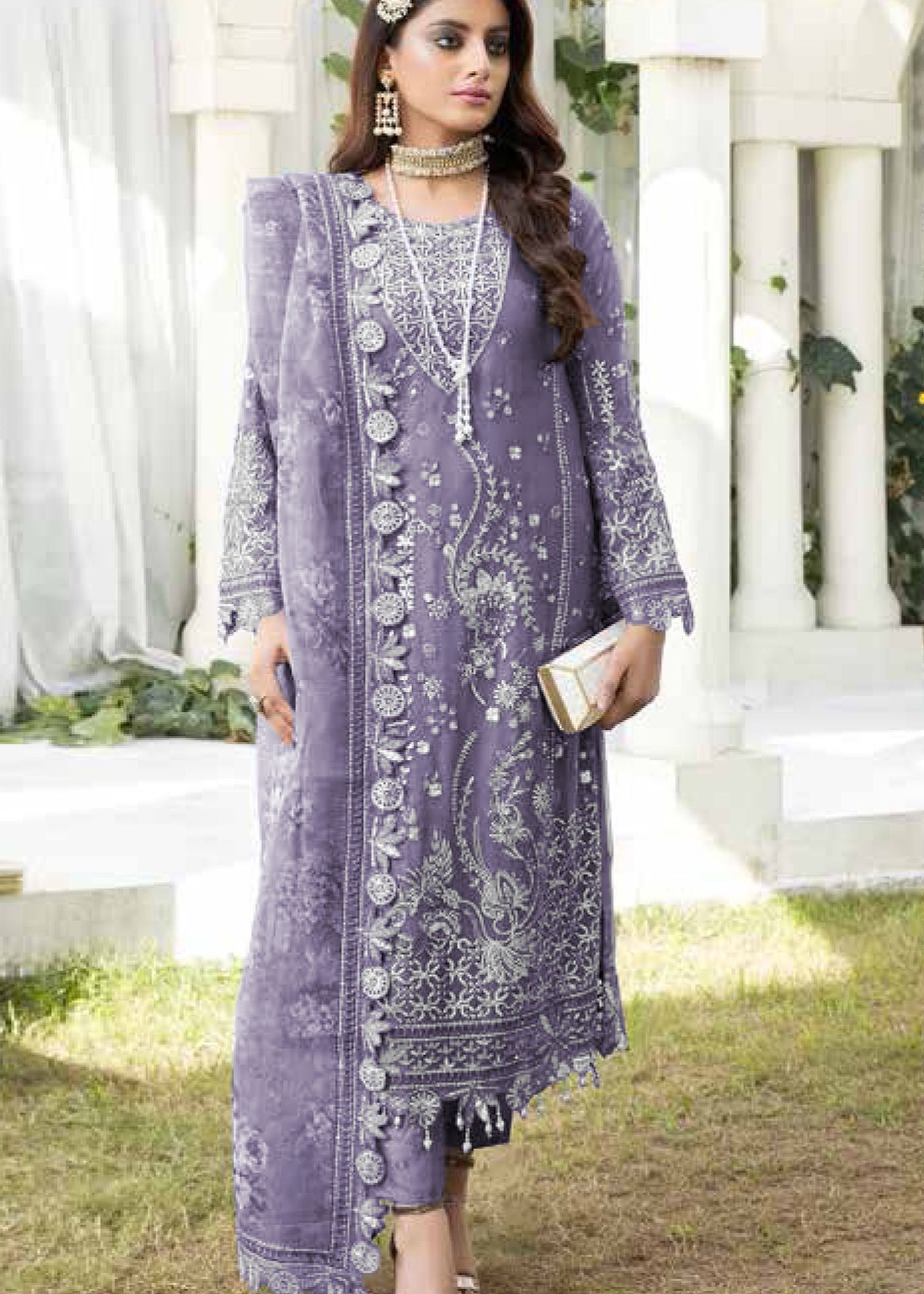 Grace your special occasions with timeless elegance in this Purple Heavy Designer Suit, a regal ensemble that embodies femininity and sophistication. Designed in a luxurious Georgette fabric, the kameez offers a graceful drape and refined sheen, enhanced with exquisite heavy embroidery work that captures the essence of artisanal craftsmanship.