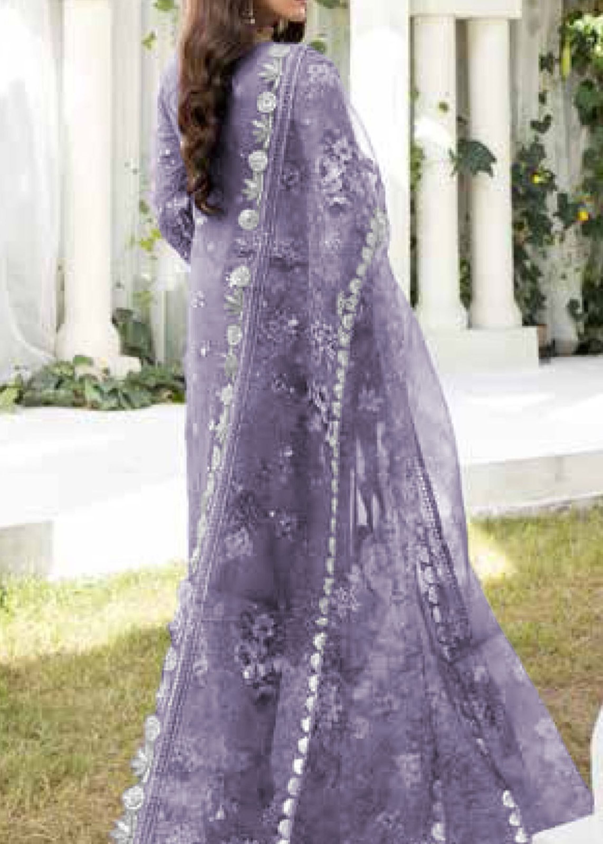 The Santoon bottom ensures comfort and structure, while the ethereal Organza dupatta in matching purple adds a dreamy, delicate finish with a soft, flowy touch. Measuring 44 inches in top length, this suit is tailored to flatter with its elongated silhouette—making it ideal for festive gatherings, weddings, or evening soirées.