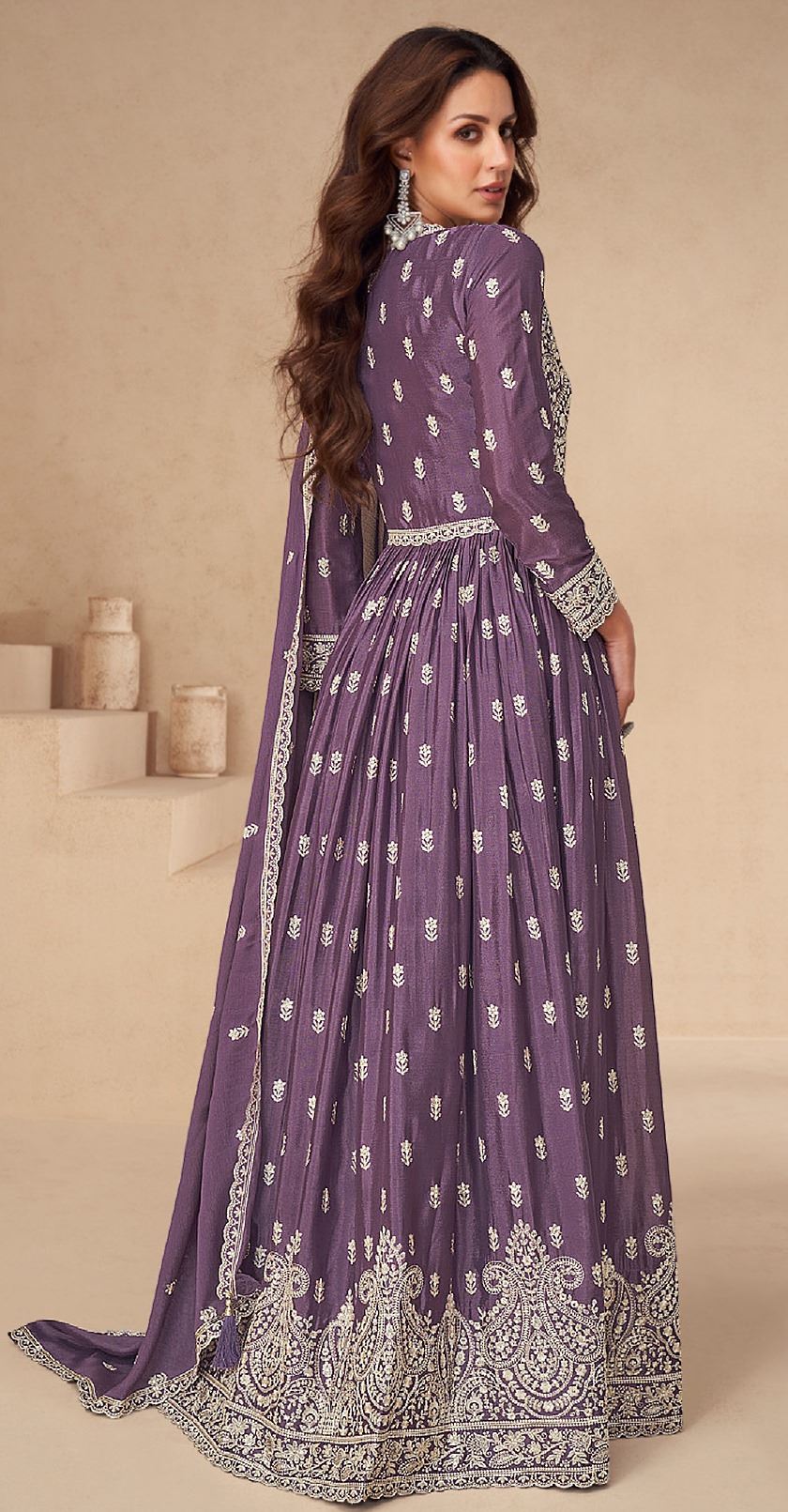 Make a majestic statement with this Purple Heavy Designer Suit, designed for the modern woman who cherishes tradition with a touch of grandeur. Tailored from luxurious Chinon fabric, the 56-inch long kameez features intricate heavy embroidery work that exudes richness and charm, making it a standout piece for weddings, festive celebrations, and evening functions.