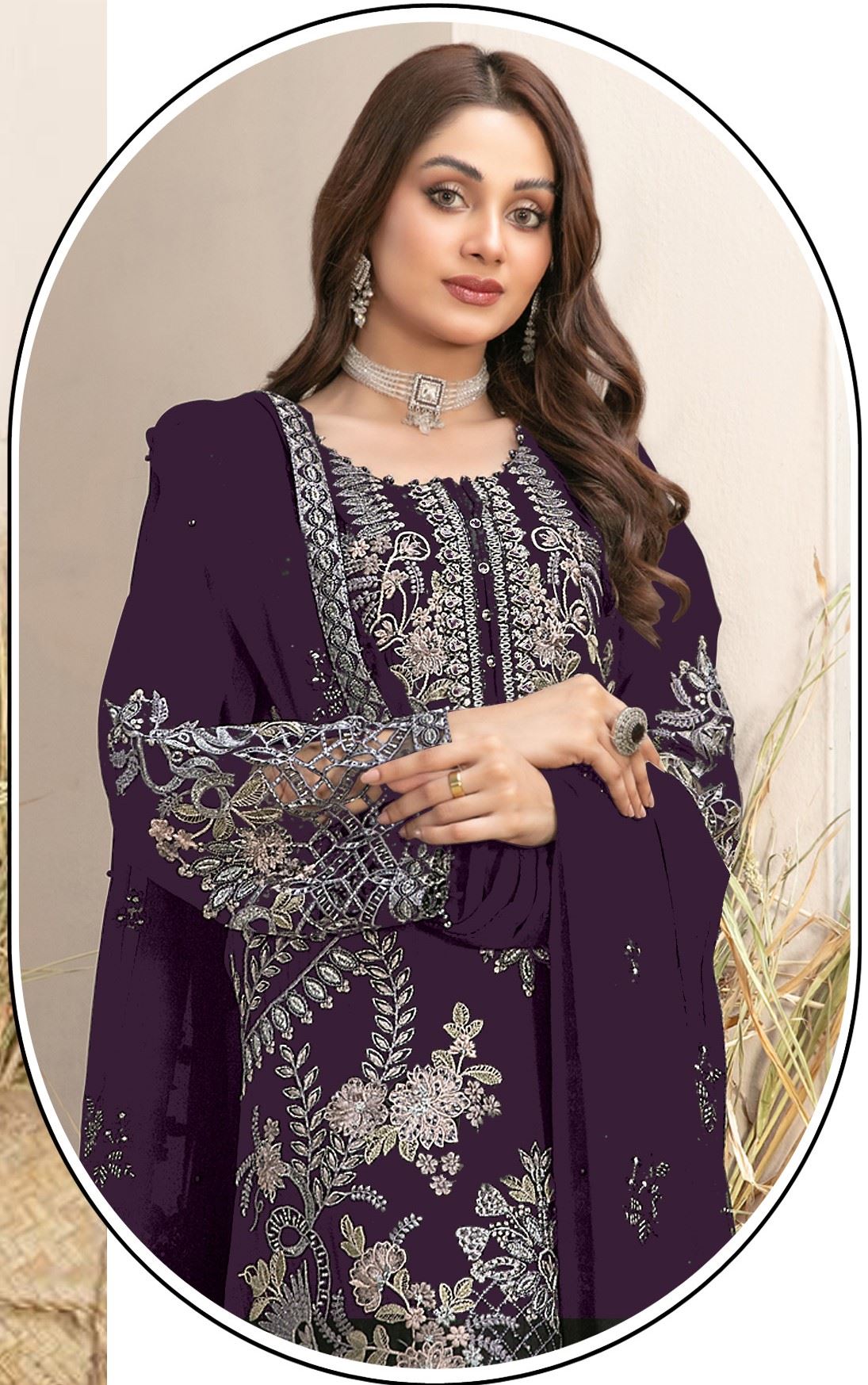 The deep purple hue adds a royal touch, making it an ideal pick for festive gatherings, wedding functions, or evening celebrations. The comfortable Santoon bottom offers a seamless fit and all-day wearability, while the matching Georgette dupatta drapes beautifully, completing the look with fluid grace.