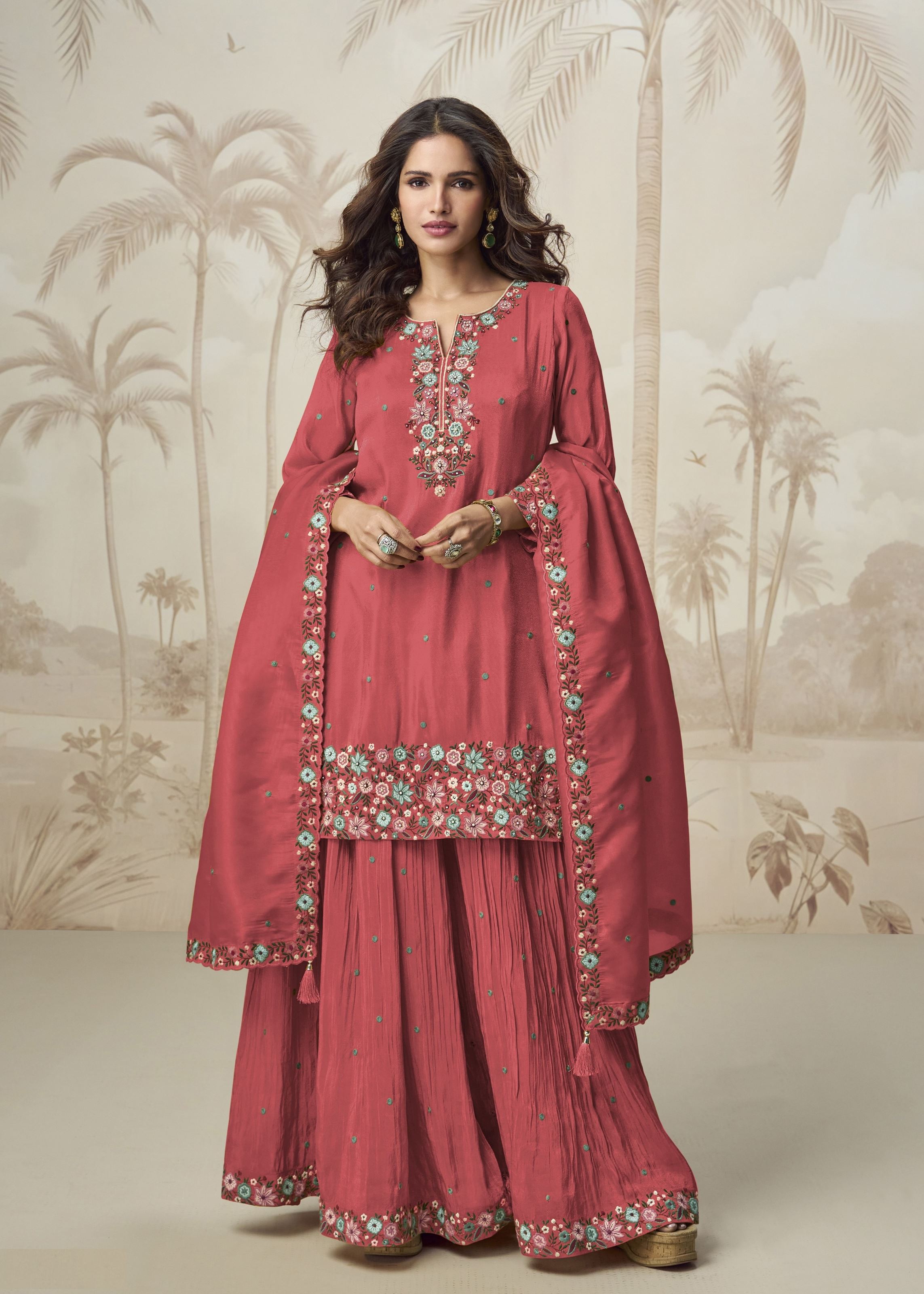 The suit is elevated with intricate heavy embroidery work, perfectly balancing detailed craftsmanship and festive elegance. The Roman Simar fabric offers a premium feel with a soft touch and smooth drape, ensuring you stay comfortable while looking effortlessly graceful. Ideal for weddings, receptions, or grand festivities, this suit defines ethnic sophistication.