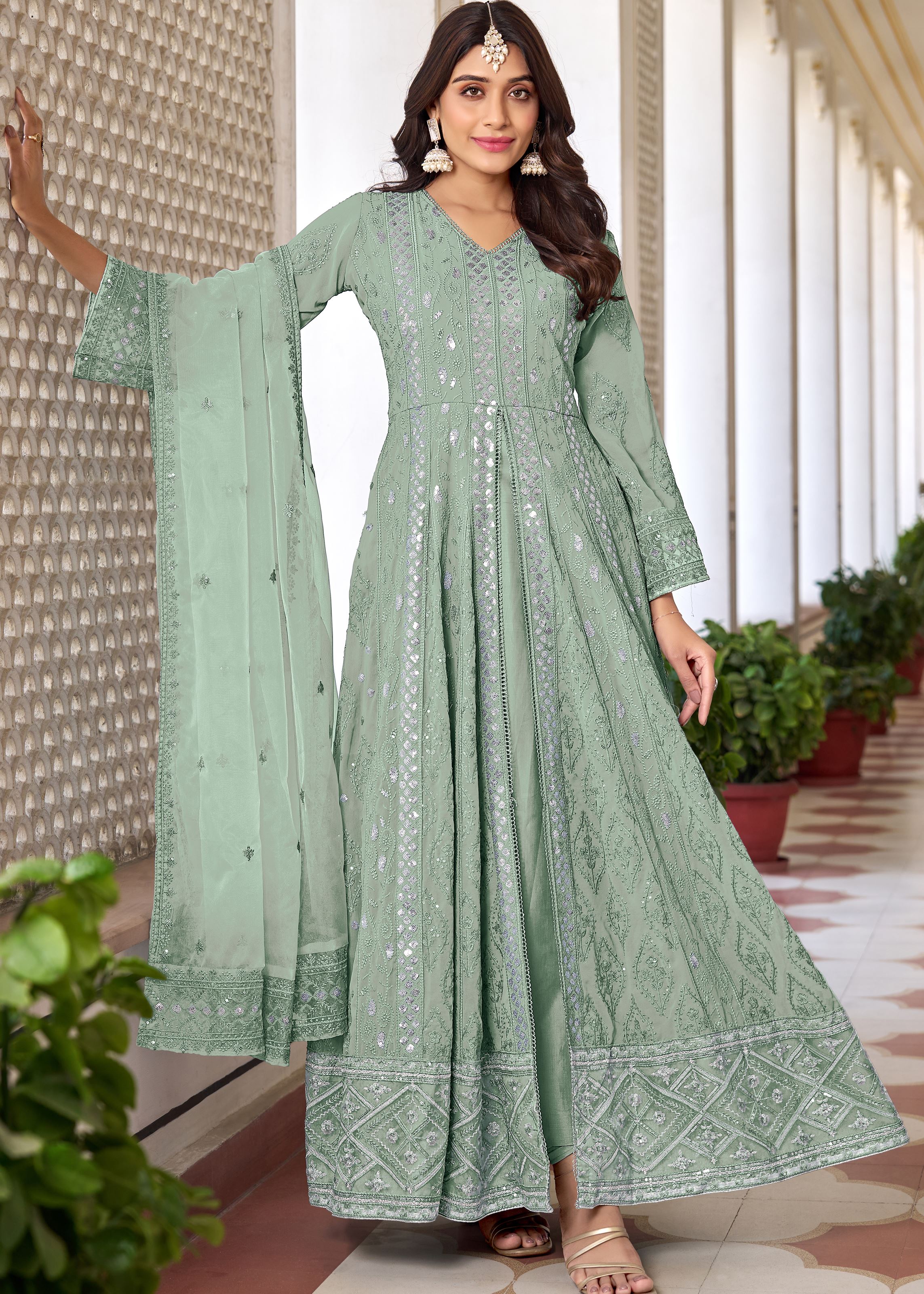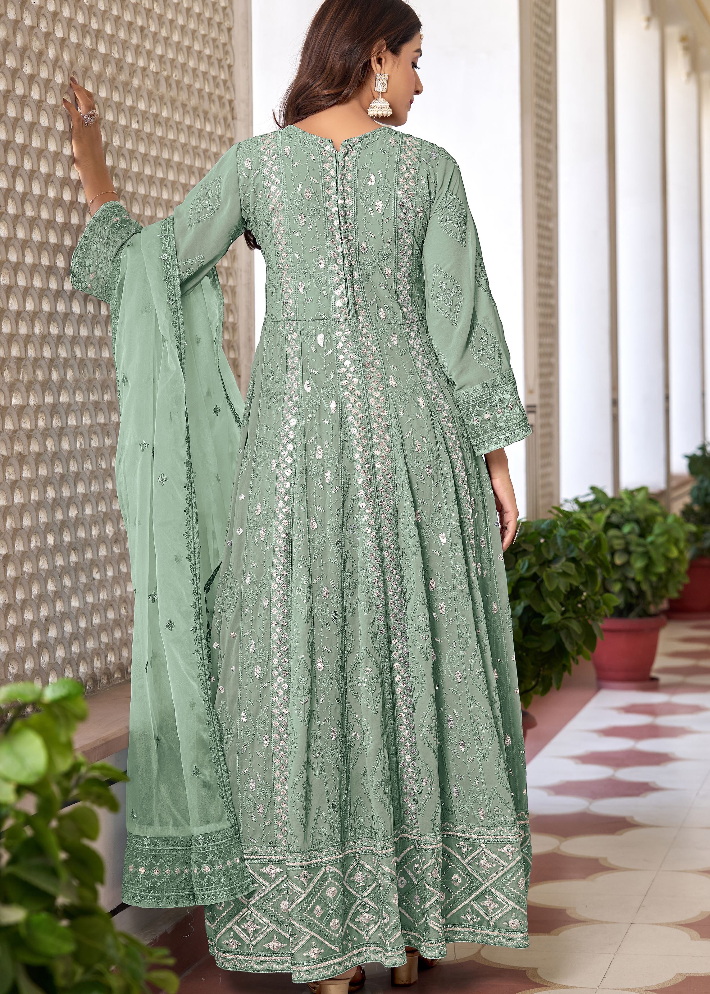 Sage Green Salwar Kameez with Heavy Thread Embroidery With Sequince Work