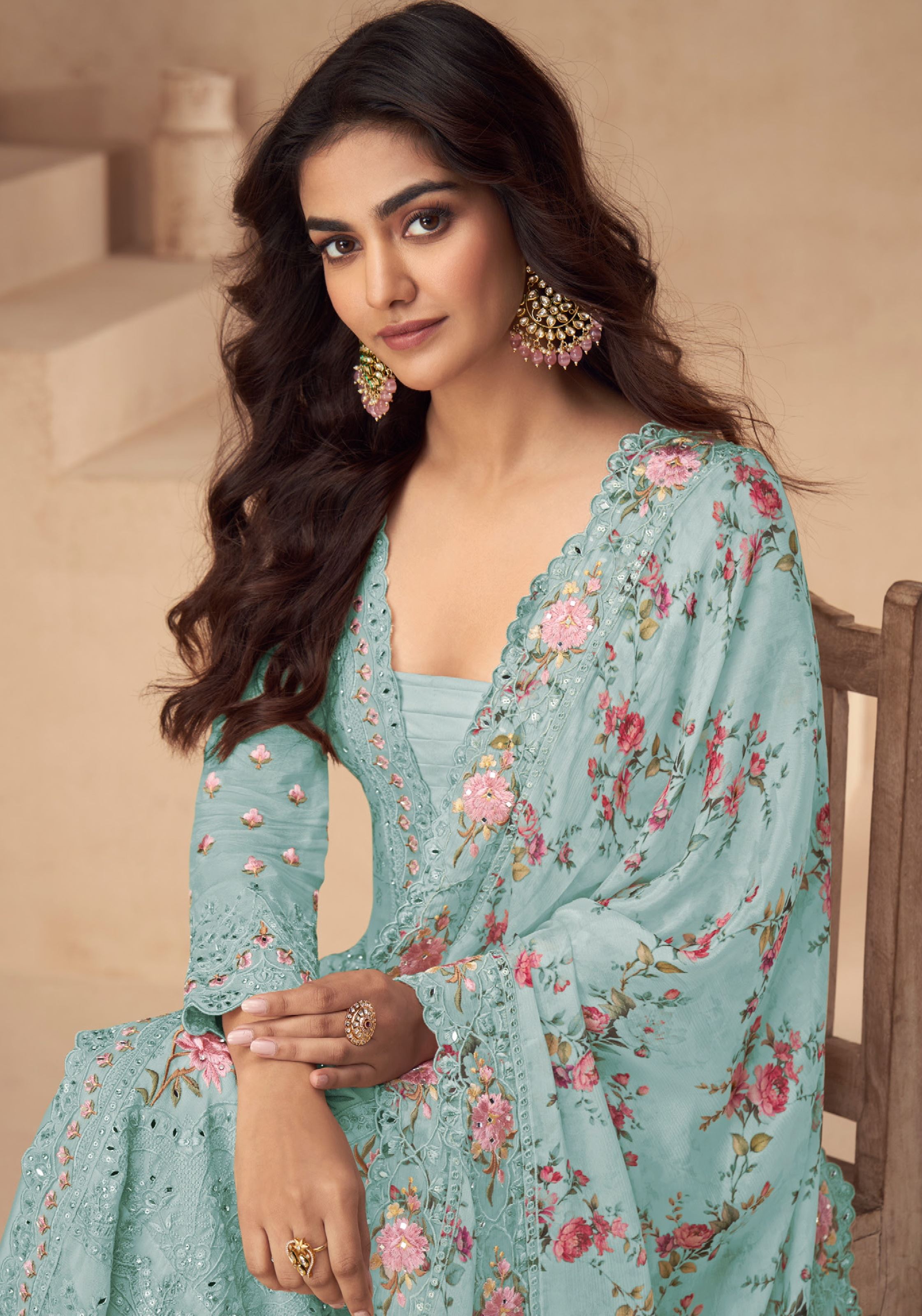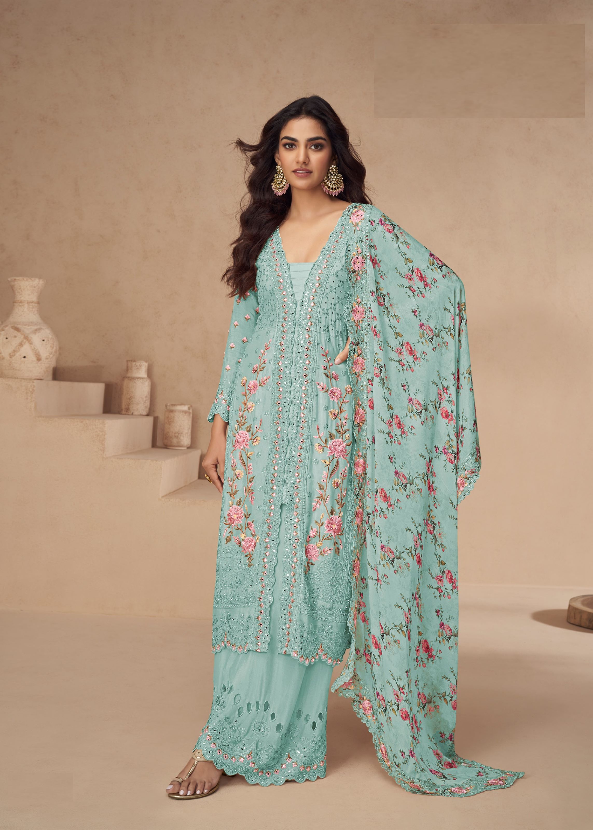 Sky Blue Heavy Designer Suit With Heavy Embroidery Work