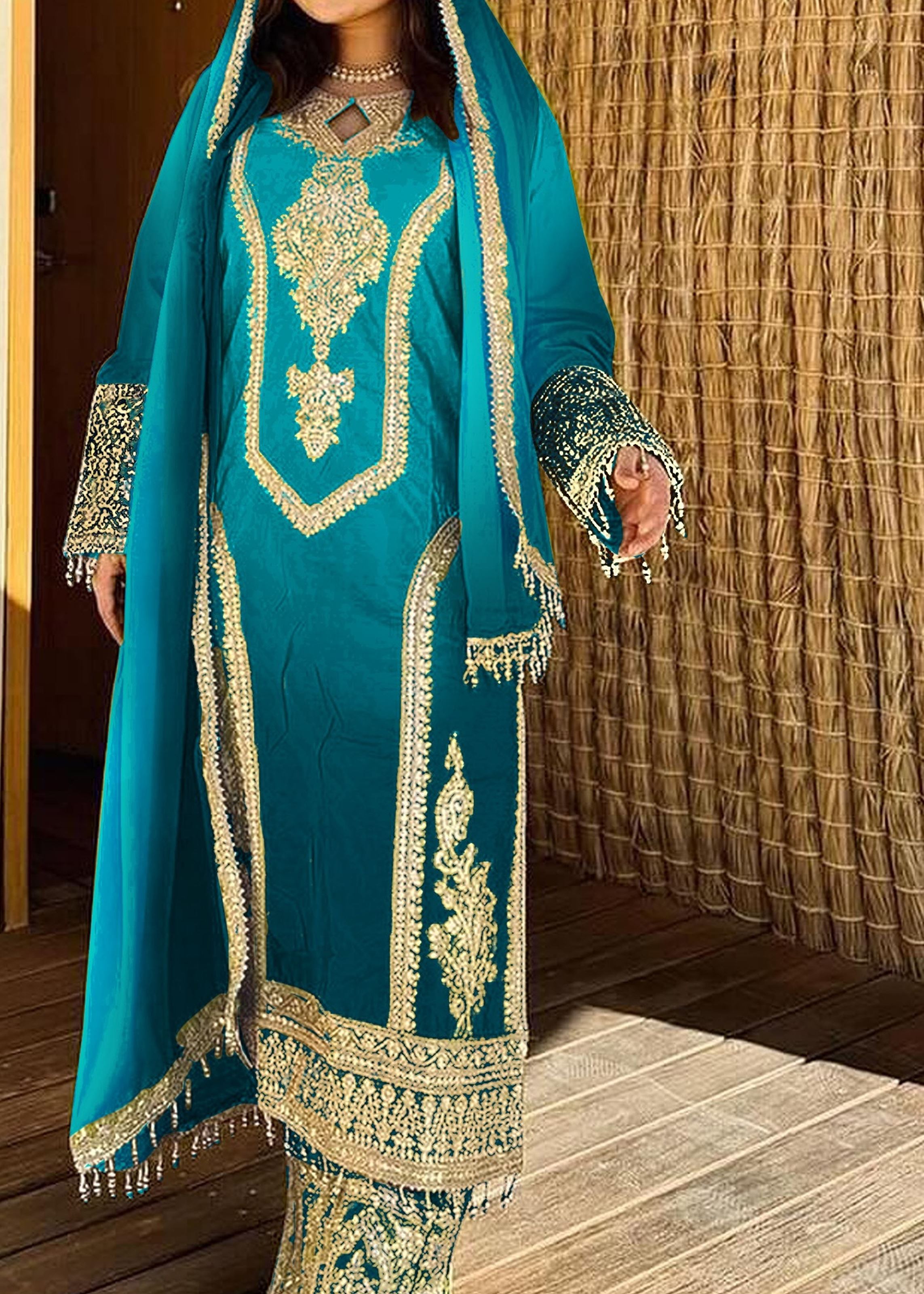 Now available with custom tailoring options, worldwide shipping, and quick delivery across India, USA, UK, Canada, and the Gulf countries, this sky blue designer suit is a refreshing and timeless pick for the modern woman.