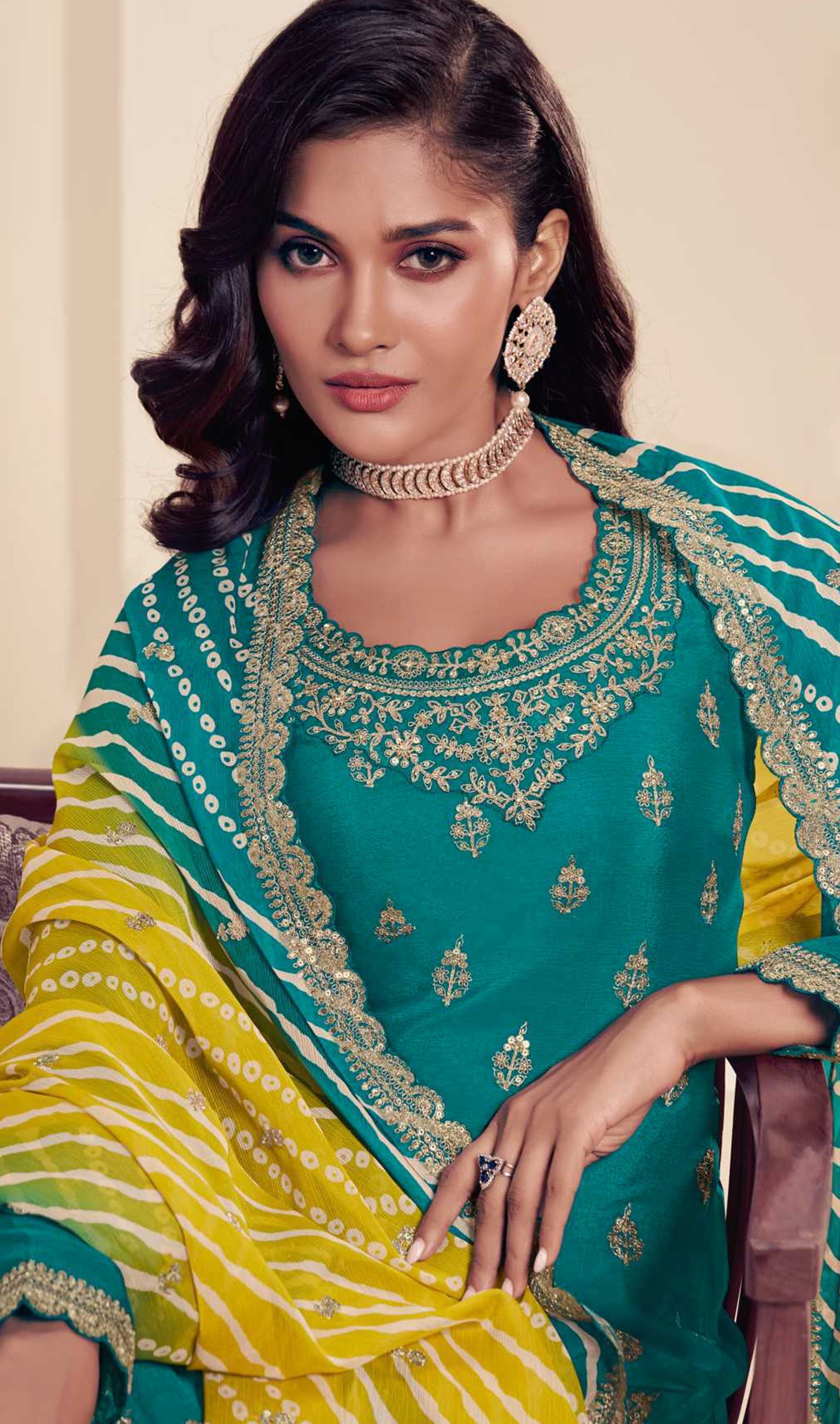 Elevate your ethnic wardrobe with this exquisite Sky Blue Heavy Designer Suit, a harmonious blend of grace and intricate craftsmanship. Made from premium chinon fabric, the 46-inch kameez showcases heavy embroidery work that beautifully stands out against the calming sky-blue shade. The fine embroidery adds a luxurious touch, making it an ideal choice for festive gatherings, pre-wedding events, or traditional functions.