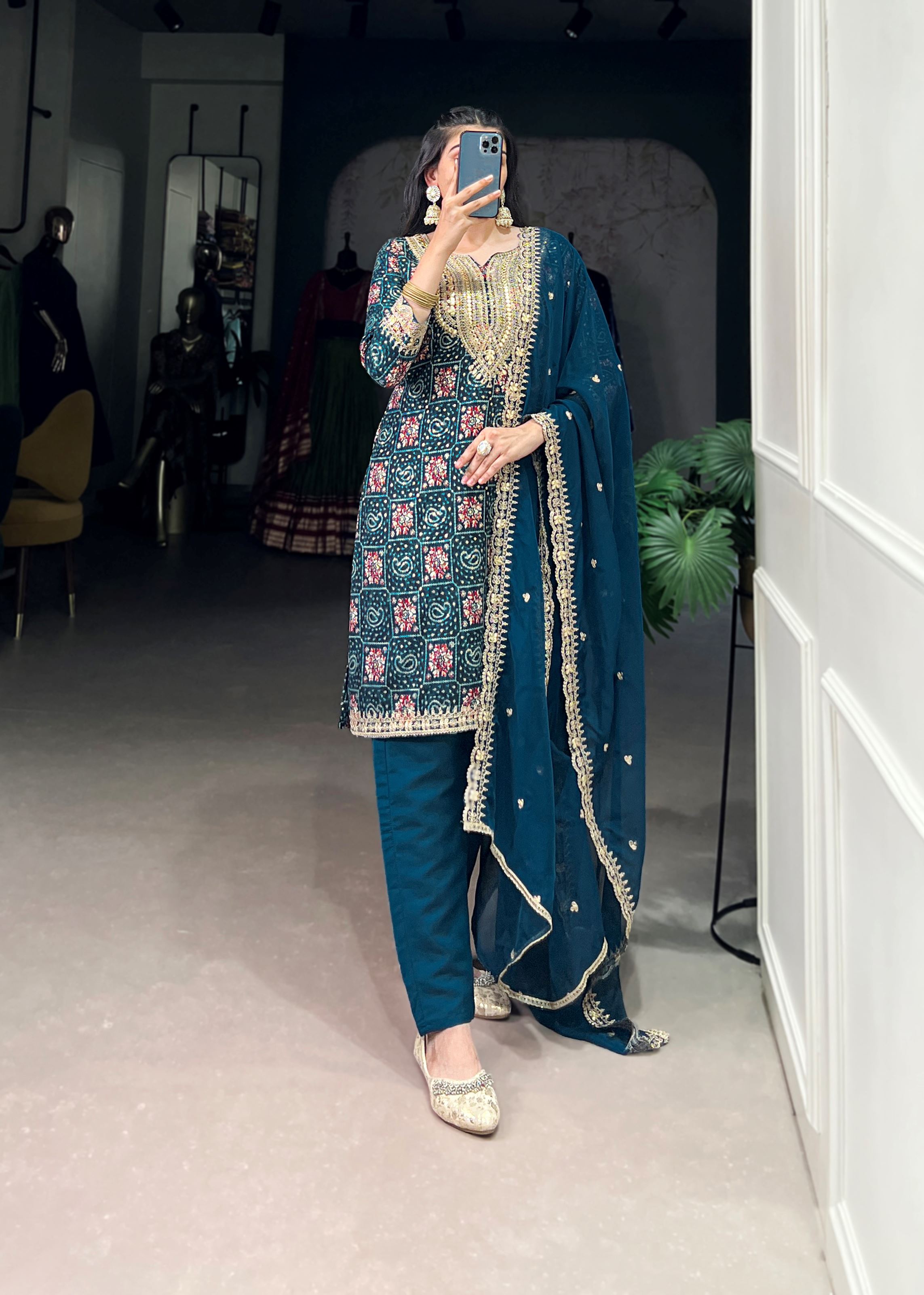 The outfit includes a matching teal straight pant in Roman Silk, offering a sleek silhouette with a touch of polish. A lightweight Organza dupatta in coordinating teal completes the set, adding a gentle layer of sophistication and texture. The combination of three distinct fabrics makes this suit a versatile and season-friendly addition to your wardrobe.