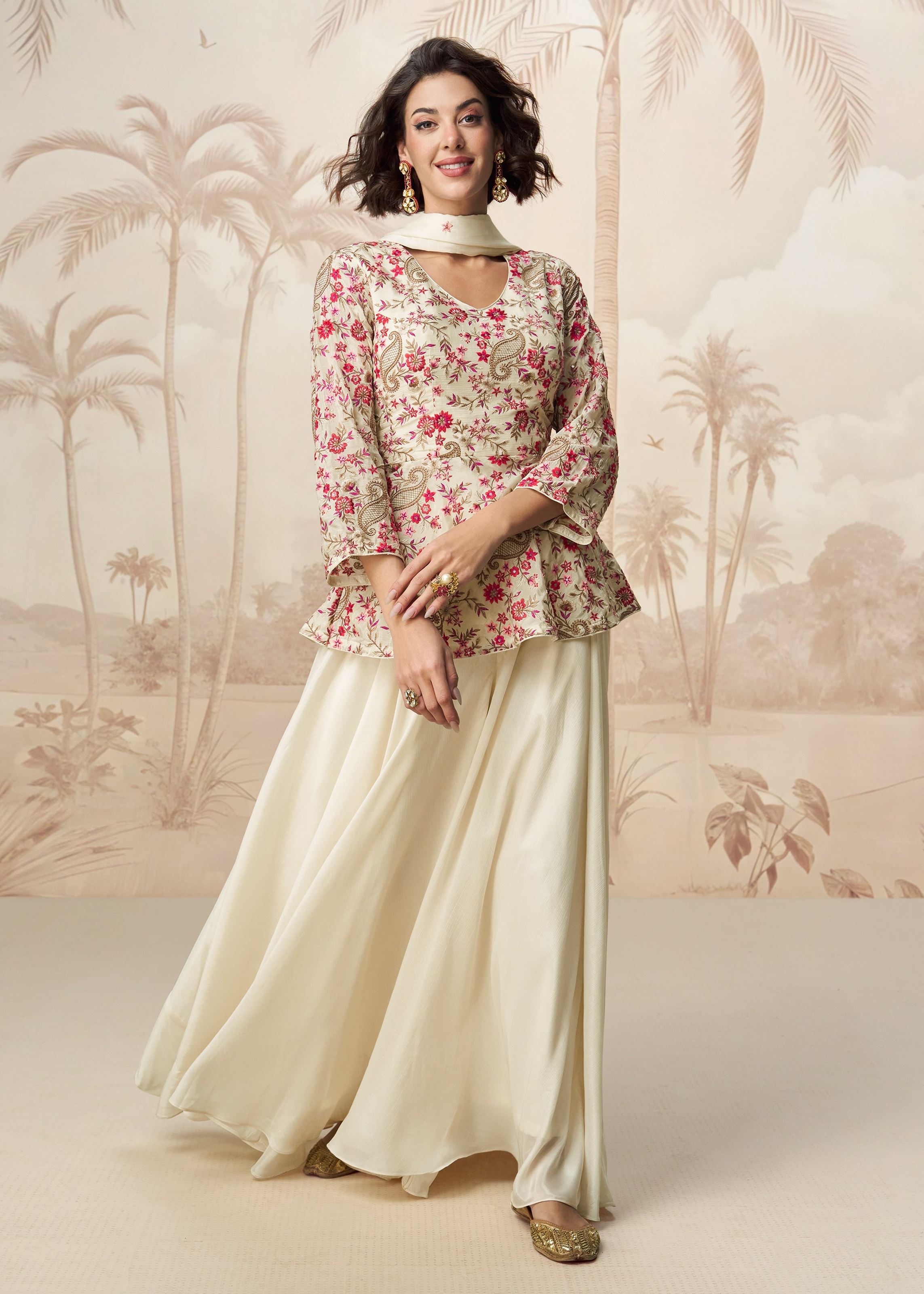 The coordinating Chinon bottom ensures comfort without compromising style, while the matching Chinon dupatta drapes gracefully, enhanced with complementary embroidery that adds to the suit’s opulent appeal. The monochrome white palette brings timeless sophistication, perfect for both daytime elegance and evening glam.