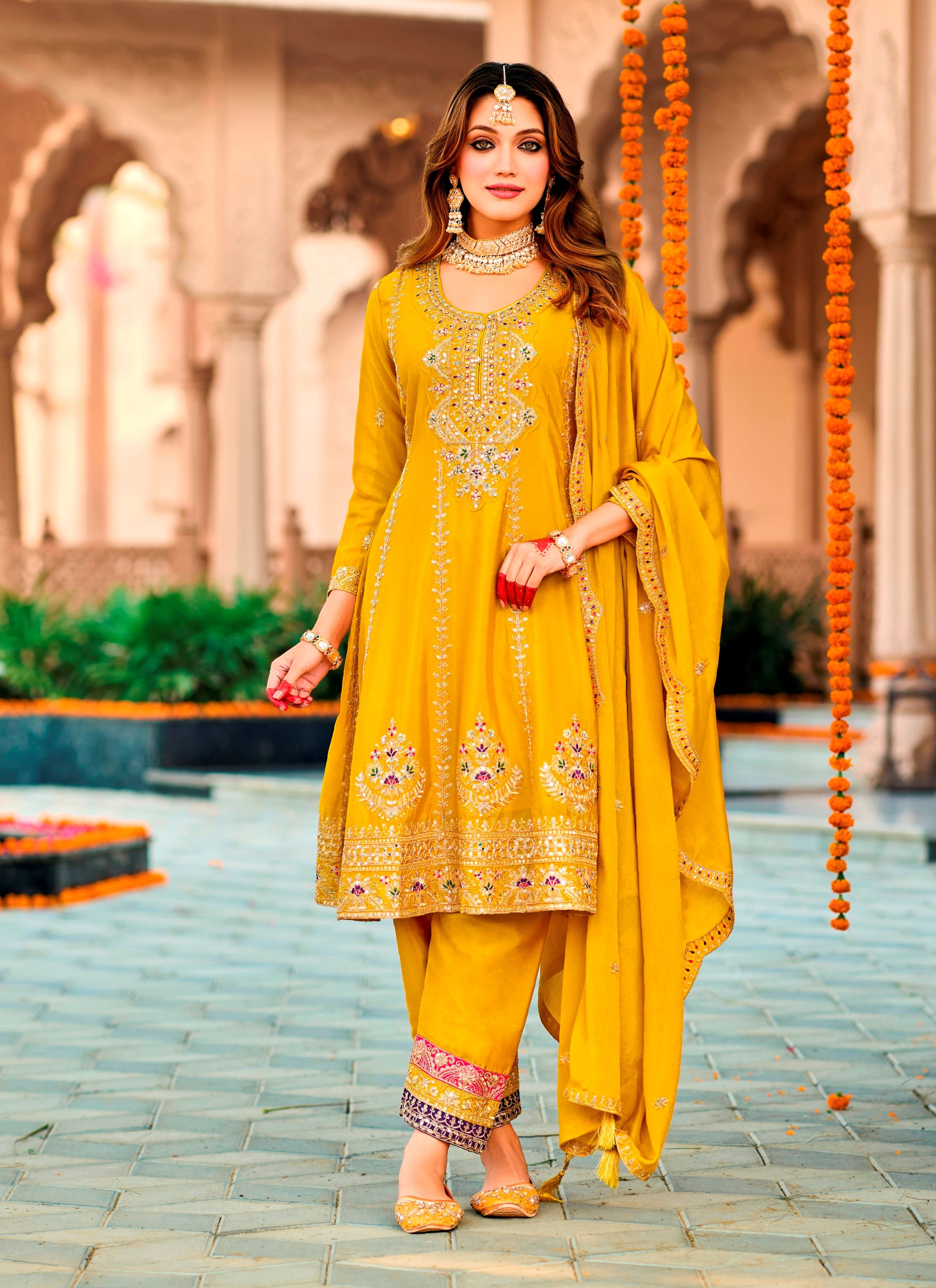 Brighten up your festive look with this radiant Yellow Heavy Designer Suit, beautifully tailored in premium Chinon fabric for a soft, graceful fall and luxurious sheen. The rich embroidery work adds a royal touch, making this ensemble an ideal pick for celebrations, haldi ceremonies, or daytime wedding events.