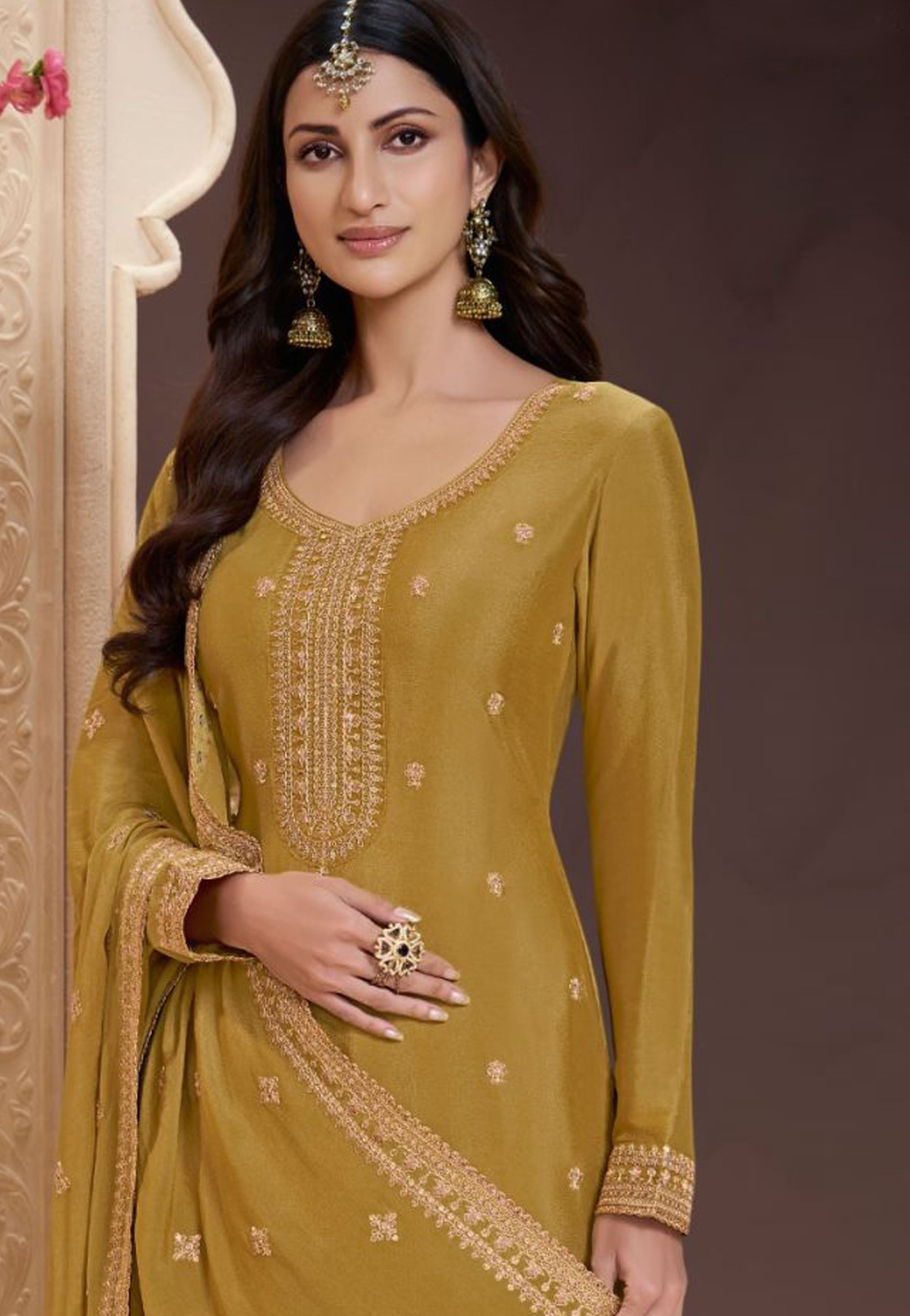 Made from soft chinon fabric, the top showcases a cheerful yellow shade enhanced by heavy embroidery that adds richness and texture. The matching chinon palazo bottom provides a relaxed fit, ensuring all-day comfort. The coordinating yellow chinon dupatta completes the set, offering a fluid drape and cohesive look.
