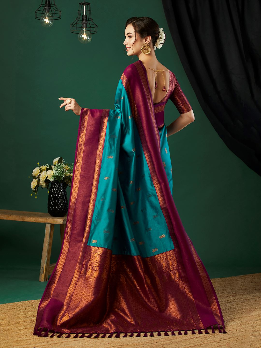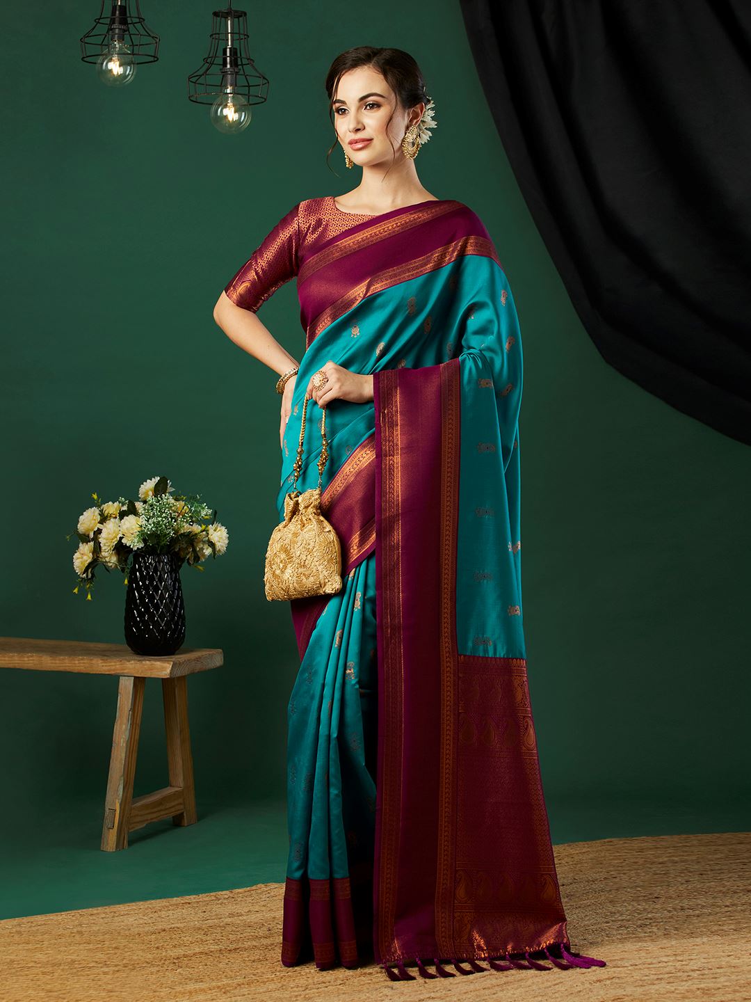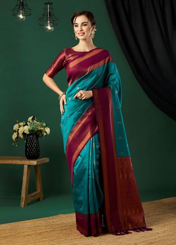 Paired with a contrasting maroon silk blouse, this saree offers a striking balance of elegance and vibrance. Its luxurious drape, combined with the glamour of heavy woven detailing, makes it a perfect choice for women who want to make a bold style statement. The saree not only reflects heritage craftsmanship but also ensures comfort and durability, making it a treasured addition to your ethnic collection.