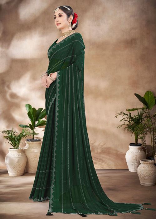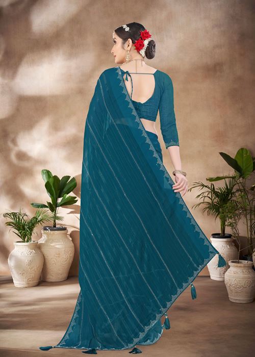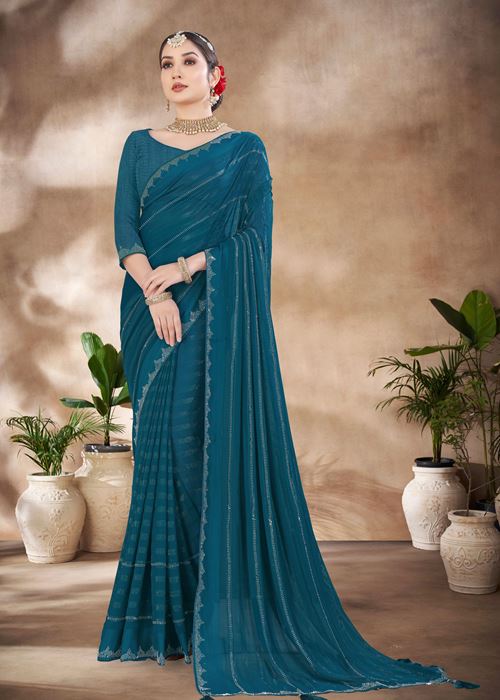 Aqua Blue Chiffon Saree With Swarovski Diamond Work