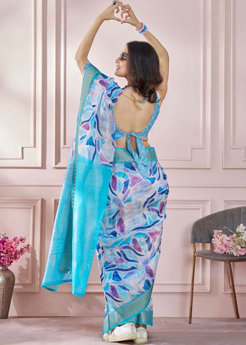 Aqua Blue Soft Silk Saree With Printed