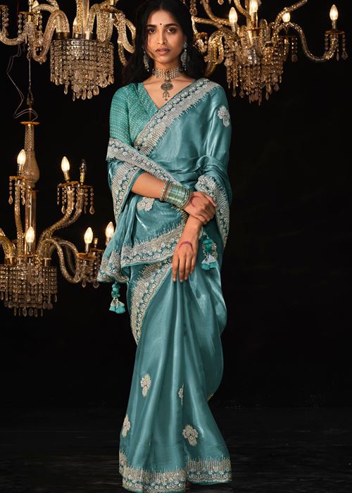 Aqua Blue Tissue Silk Saree With Heavy Thread and Zari Embroidered Work
