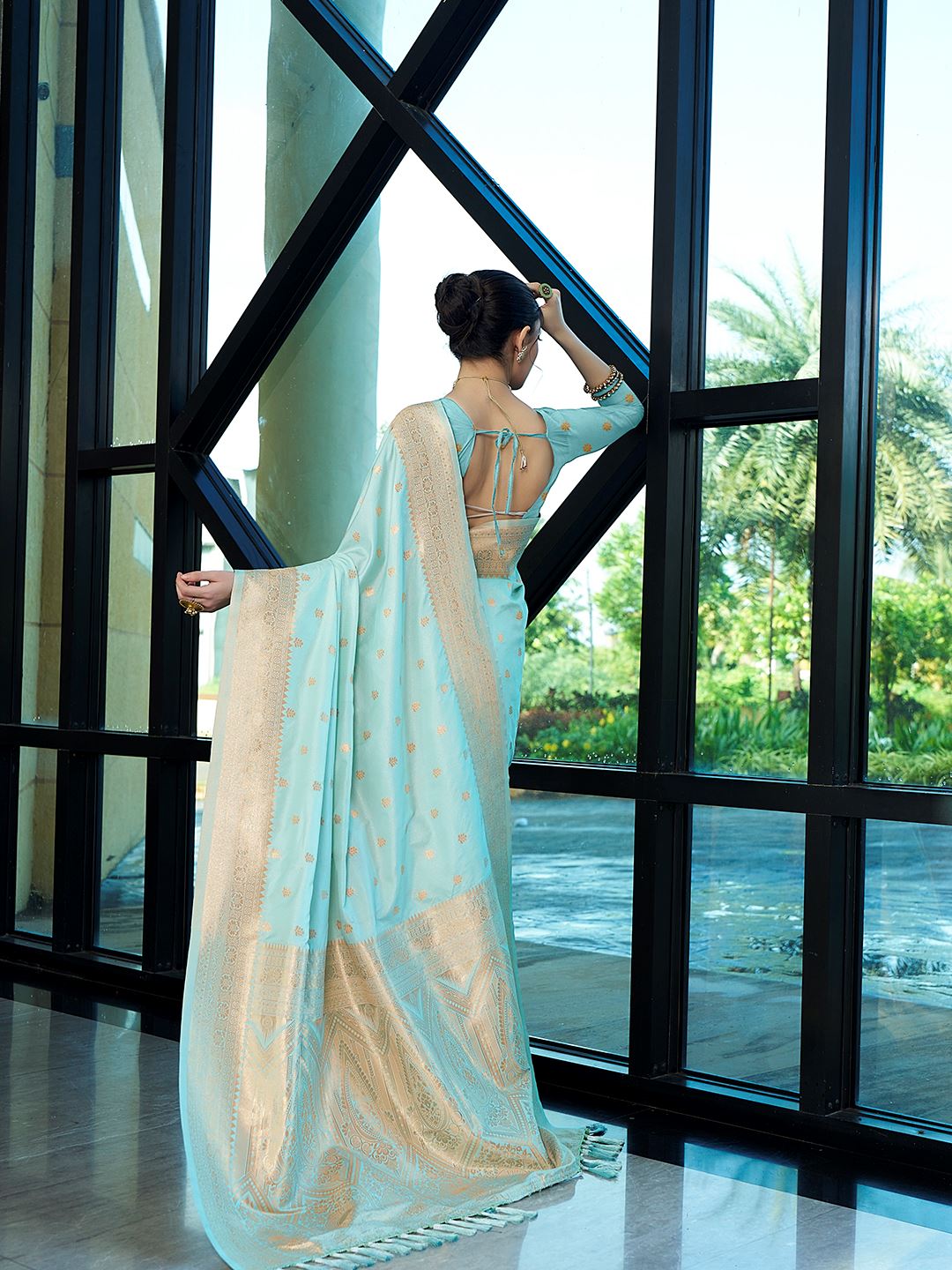 Paired with a matching aqua blue art silk blouse, the ensemble offers versatility in styling. Team it with temple jewelry for a classic ethnic appeal or pair with statement accessories for a more contemporary celebration look. Whether it’s a family function or a festive evening, this saree guarantees all eyes on you.A symbol of grace, tradition, and designer elegance, this Banarasi woven jacquard saree is a wardrobe essential for every woman who treasures ethnic beauty.