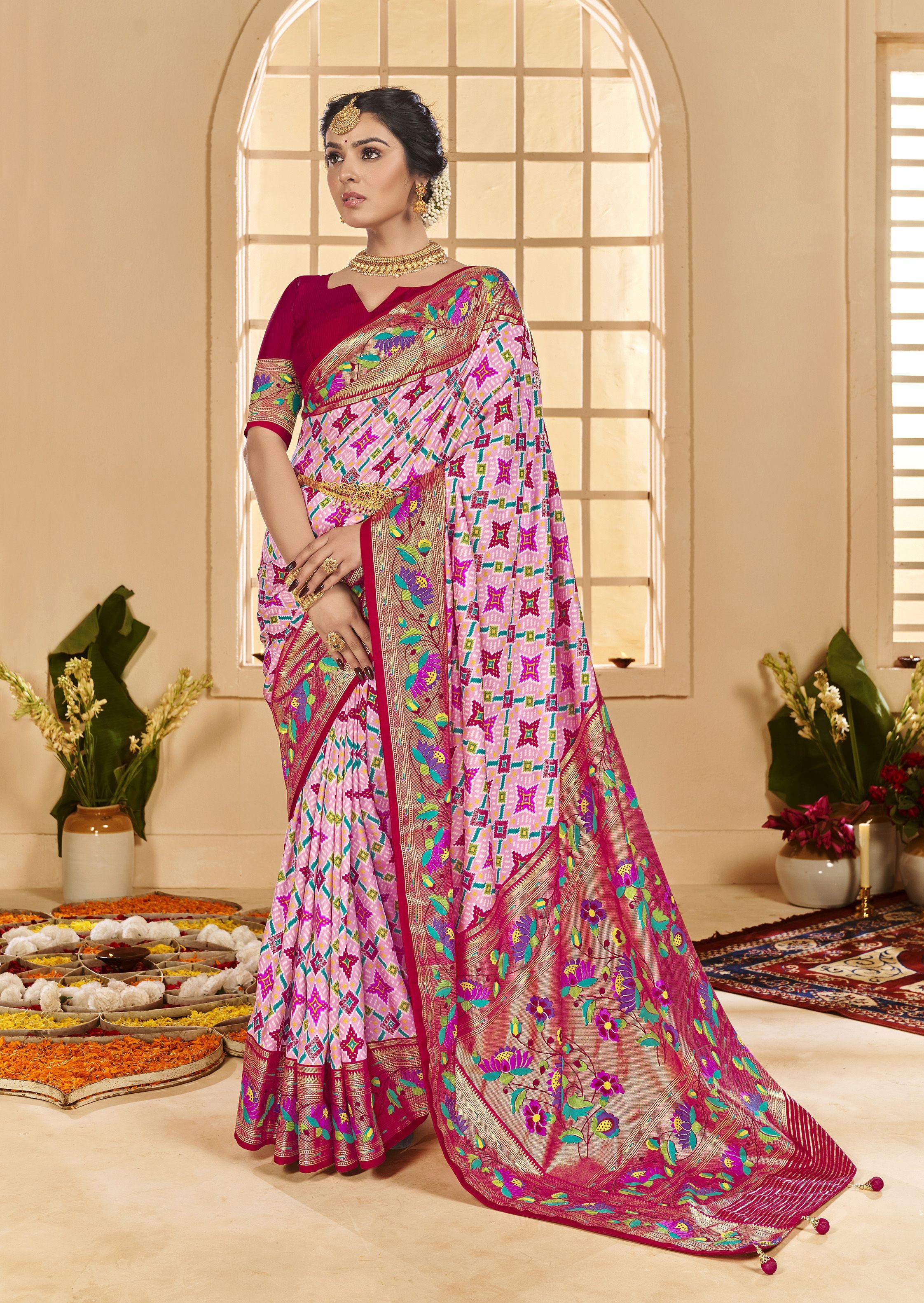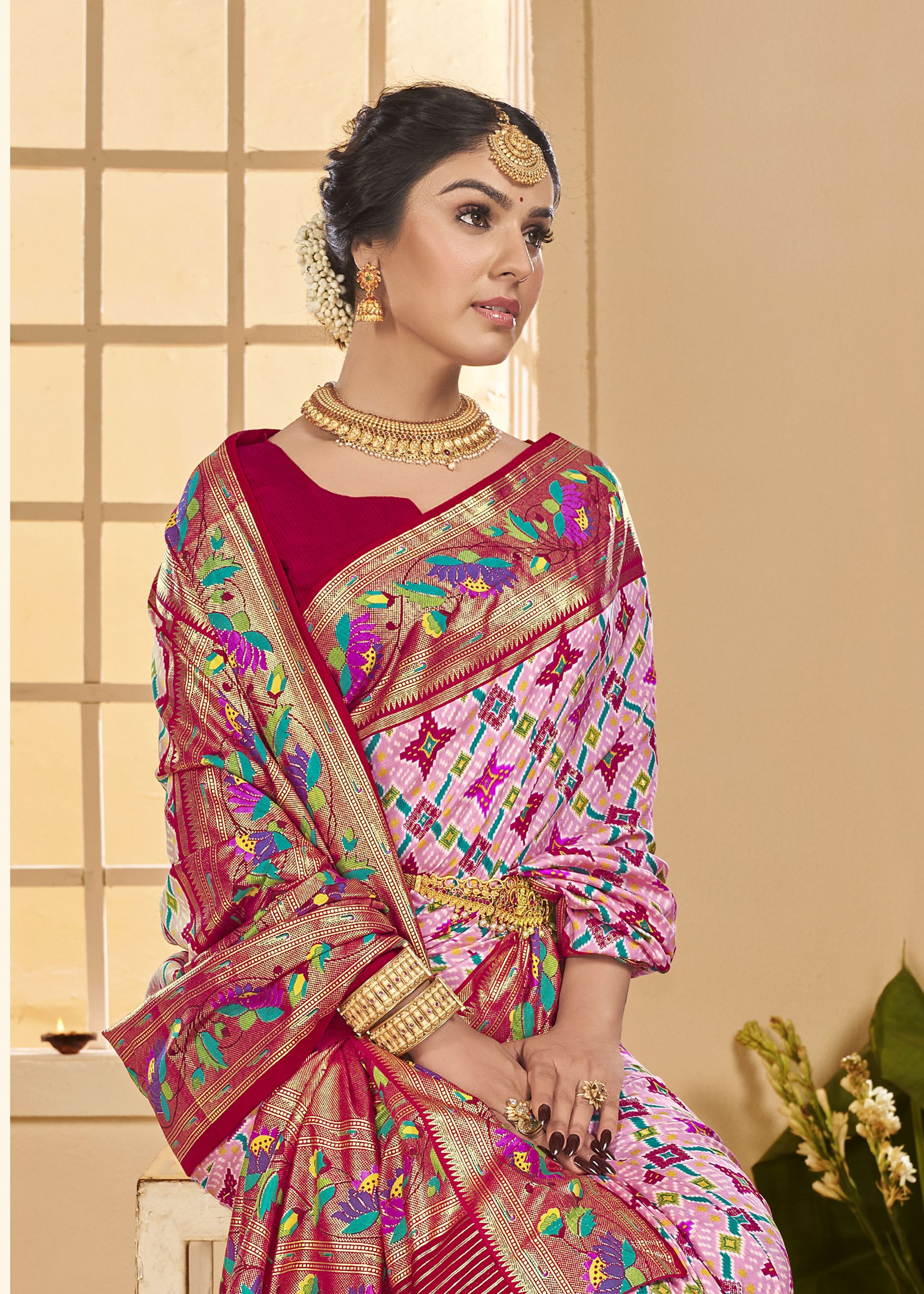 Baby Pink Ethnic Woven Border Designer With Ikkat Printed Cotton Silk Saree