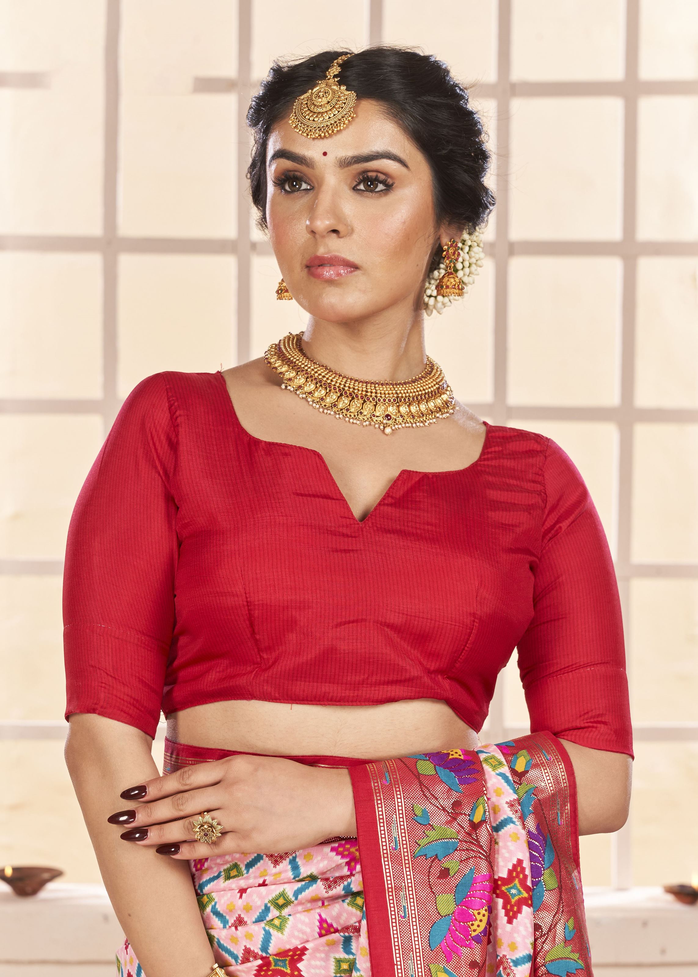 The saree features an exquisite woven ikkat-inspired border, adding intricate detail and elevating its ethnic appeal. Its soft silk blend fabric ensures a smooth drape, offering comfort without compromising on style. Accompanied by a matching baby pink blouse in silk blend fabric, this ensemble creates a seamless and coordinated look that is both subtle and stunning.