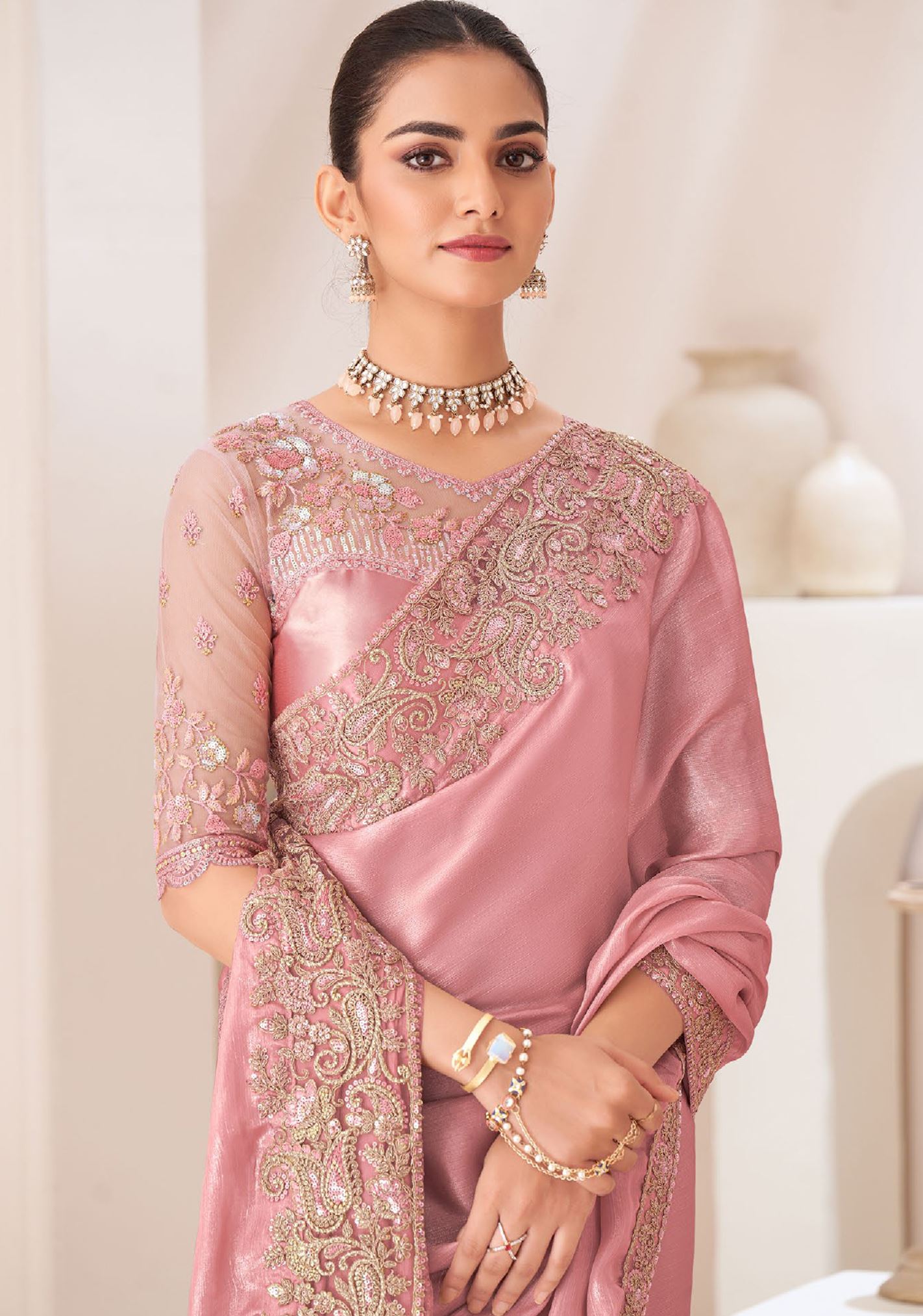 Baby Pink Saree With Heavy Embroidered Work