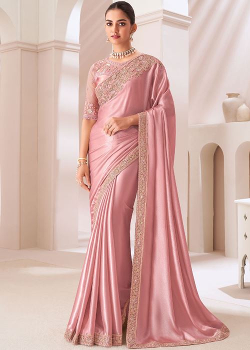 Baby Pink Satin Chiffon Saree With Heavy Thread Embroidery Sequins Work Lace Border Saree With Embroidery Blouse