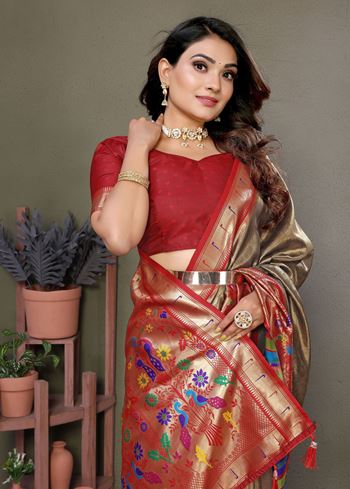 The saree is paired with a contrasting burgundy silk blend blouse, providing a perfect balance of richness and style. You may choose to enhance it with embroidery or beadwork for a more festive appeal, or keep it simple to highlight the intricate woven patterns of the saree.Style it with traditional golden jewelry, temple sets, or kundan ornaments, and let the earthy yet royal tones make you the center of attention. This Brown Banarasi Tissue Silk Saree is the epitome of tradition, luxury, and modern partywear charm.