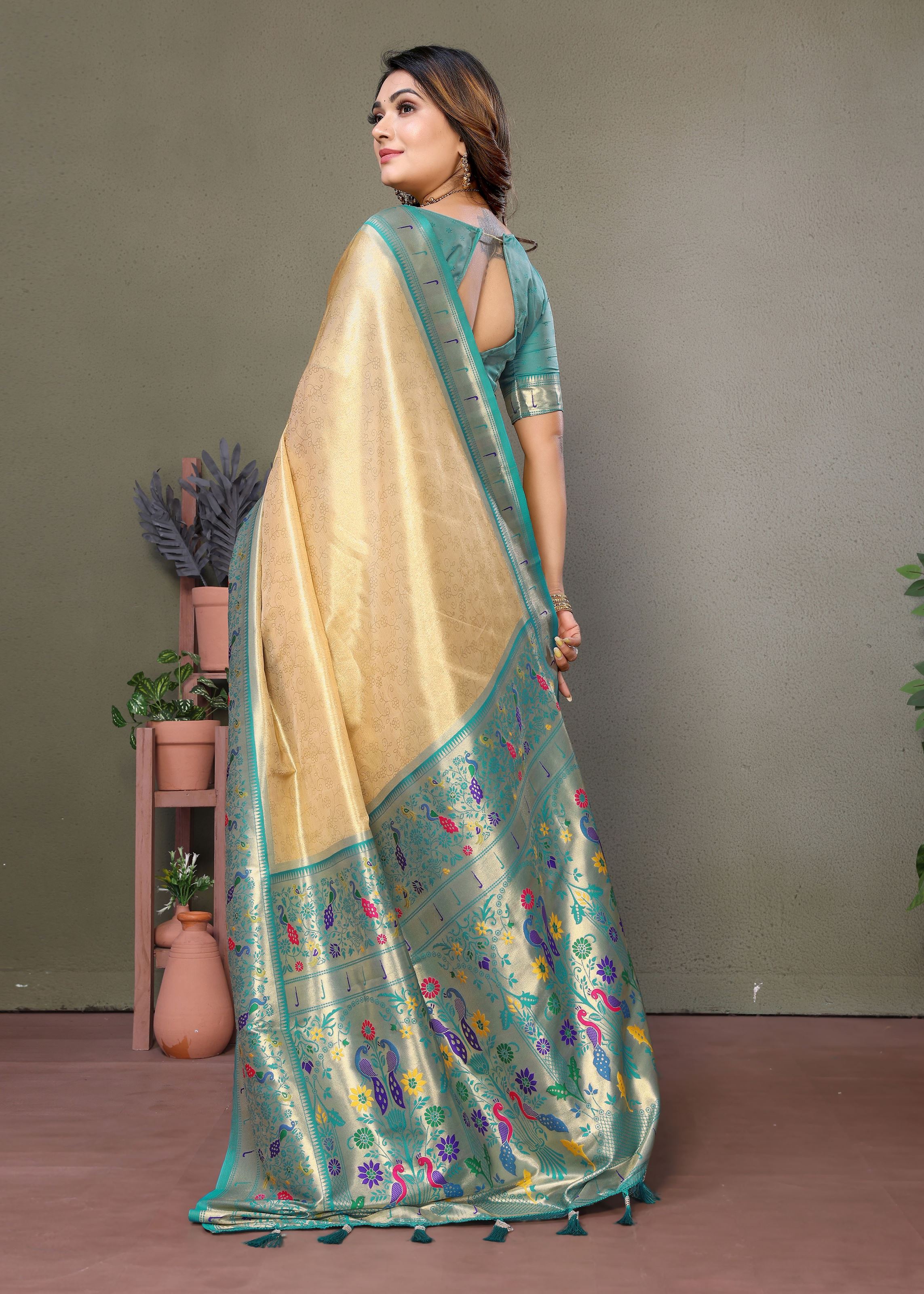 Enhancing its appeal, the saree is paired with a contrasting sea-green silk blend blouse, which adds a refreshing pop of color while complementing the earthy chiku shade. This striking combination allows for versatile styling with both traditional jewelry and contemporary accessories, ensuring you look effortlessly graceful at any occasion.Lightweight yet opulent, this Banarasi Tissue Silk saree offers comfort, flow, and a regal silhouette that flatters every wearer. A perfect addition to your ethnic wardrobe, it promises to make every celebration memorable with its classic charm.