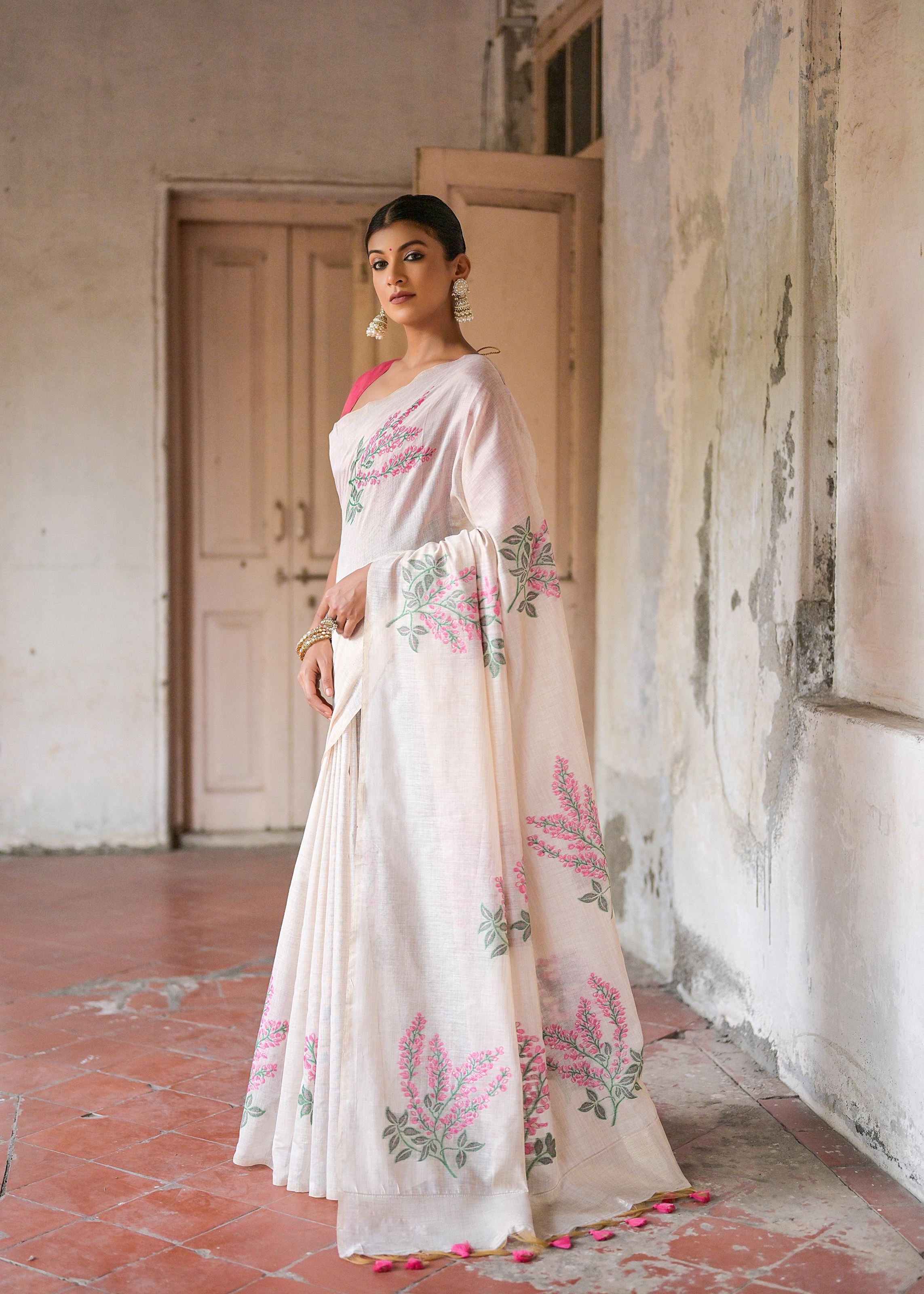 Beautiful Floral Weaving Designer Off White Muga Cotton Rich Looks Saree